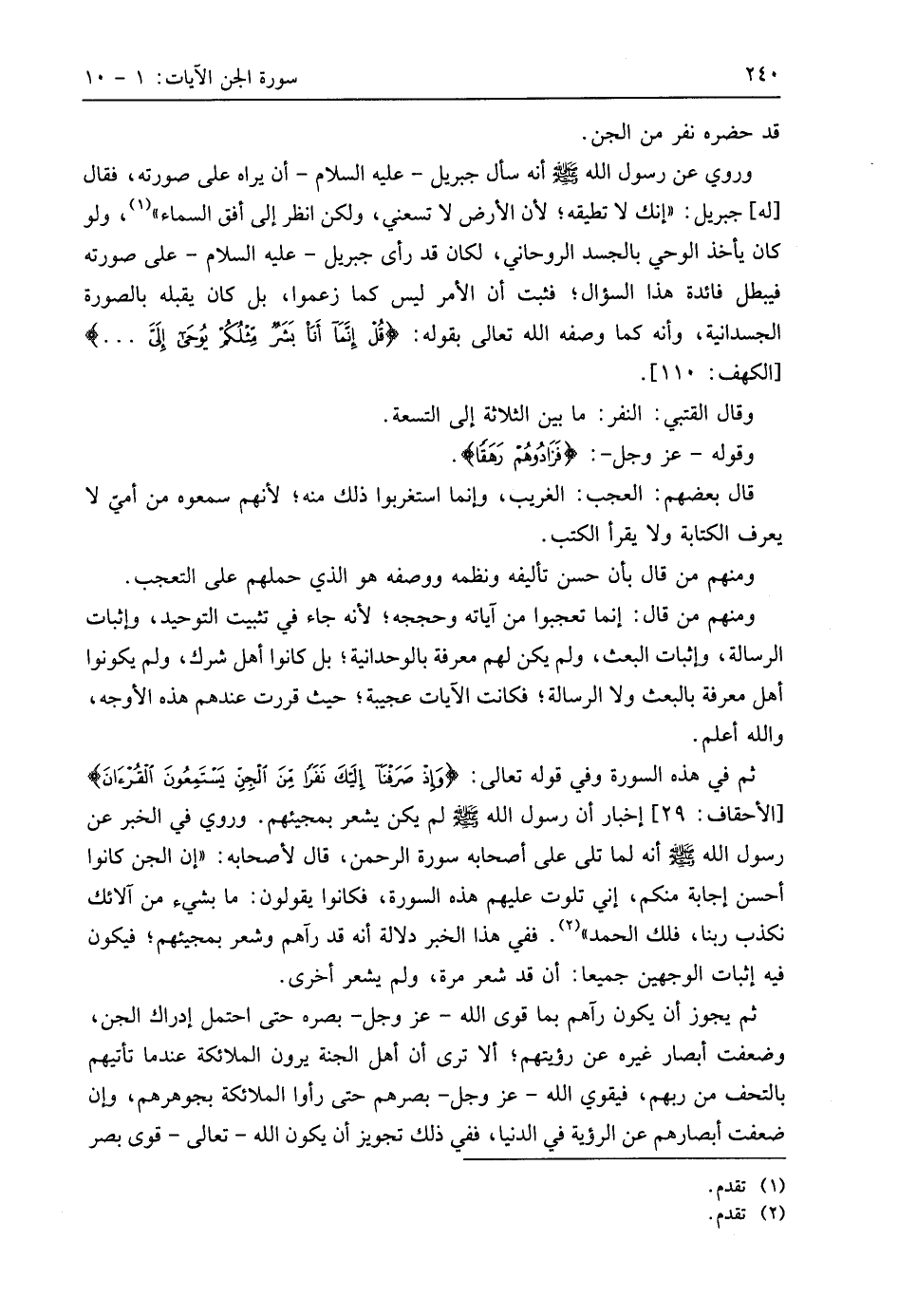 ثم في هذه السورة وفي قوله تعالى: (وَإِذْ صَرَفْنَا إِلَيْكَ نَفَرًا مِنَ الْجِنِّ يَسْتَمِعُونَ الْقُرْآنَ) إخبار أن رسول اللَّه - صَلَّى اللَّهُ عَلَيهِ وَسَلَّمَ - لم يكن يشعر بمجيئهم. وروي في الخبر عن رسول اللَّه - صَلَّى اللَّهُ عَلَيهِ وَسَلَّمَ - أنه لما تلى على أصحابه سورة الرحمن، قال لأصحابه: " إن الجن كانوا أحسن إجابة منكم، إني تلوت عليهم هذه السورة، فكانوا يقولون: ما بشيء من آلائك نكذب ربنا، فلك الحمد ". ففي هذا الخبر دلالة أنه قد رآهم وشعر بمجيئهم؛ فيكون فيه إثبات الوجهين جميعا: أن قد شعر مرة، ولم يشعر أخرى.
