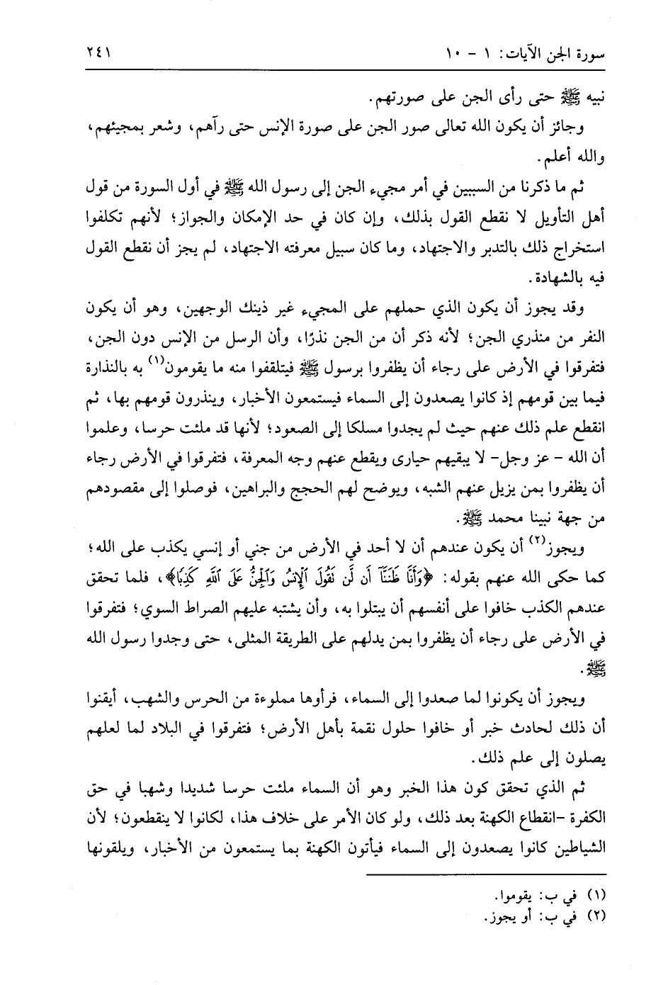 ثم ما ذكرنا من السببين في أمر مجيء الجن إلى رسول اللَّه - صَلَّى اللَّهُ عَلَيهِ وَسَلَّمَ - في أول السورة من قول أهل التأويل لا نقطع القول بذلك، وإن كان في حد الإمكان والجواز؛ لأنهم تكلفوا استخراج ذلك بالتدبر والاجتهاد، وما كان سبيل معرفته الاجتهاد، لم يجز أن نقطع القول فيه بالشهادة.