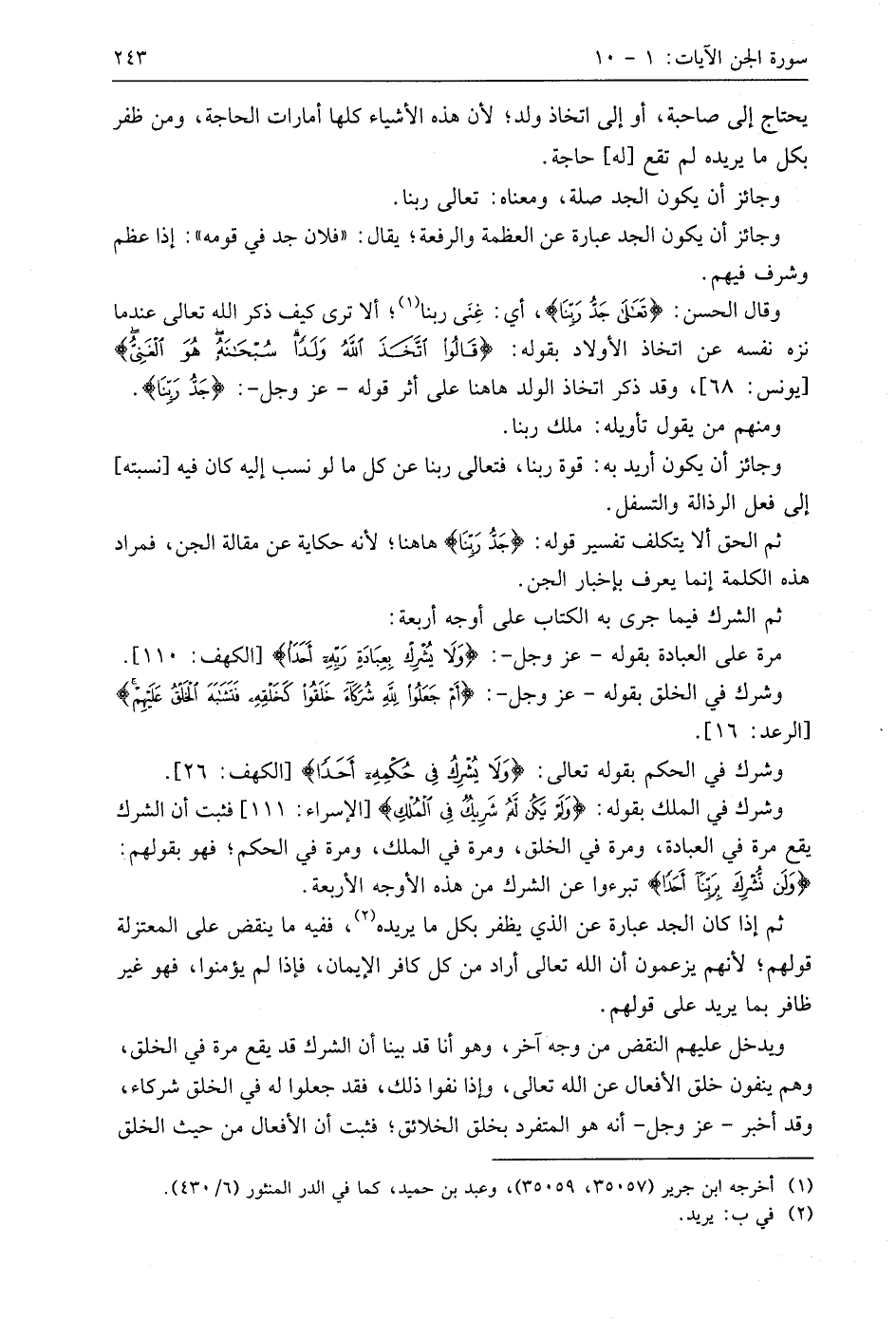 وشرك في الملك بقوله: (وَلَمْ يَكُنْ لَهُ شَرِيكٌ فِي الْمُلْكِ)، فثبت أن الشرك يقع مرة في العبادة، ومرة في الخلق، ومرة في الملك، ومرة في الحكم؛ فهو بقولهم: (وَلَنْ نُشْرِكَ بِرَبِّنَا أَحَدًا) تبرءوا عن الشرك من هذه الأوجه الأربعة.