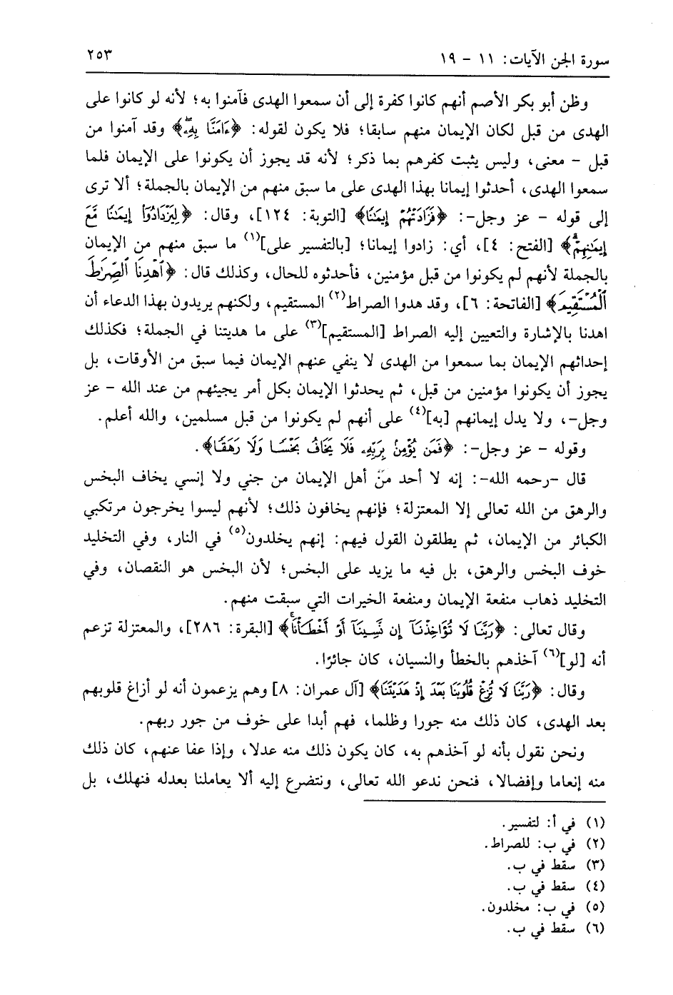 قال - رحمه اللَّه -: إنه لا أحد من أهل الإيمان من جني ولا إنسي يخاف البخس والرهق من اللَّه تعالى إلا المعتزلة؛ فإنهم يخافون ذلك؛ لأنهم ليسوا يخرجون مرتكبي الكبائر من الإيمان، ثم يطلقون القول فيهم: إنهم يخلدون في النار، وفي التخليد خوف البخس والرهق، بل فيه ما يزيد على البخس؛ لأن البخس هو النقصان، وفي التخليد ذهاب منفعة الإيمان ومنفعة الخيرات التي سبقت منهم.