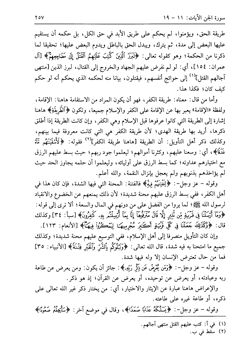 وأما من قال: معناه: طريقة الكفر، فهو أن يكون المراد من الاستقامة هاهنا: الإقامة، ولفظة " الإقامة " يعبر بها عن الإقامة على الكفر والإسلام جميعا، وتكون (الطَّرِيقَةِ) هاهنا إشارة إلى الطريقة التي كانوا عرفوها قبل الإسلام وهي الكفر، وإن كانت الطريقة إذا أطلق ذكرها، أريد بها طريقة الهدى؛ لأن طريقة الكفر هي التي كانت معروفة فيما بينهم، وكذلك ذكر أهل التأويل: أن الطريقة هاهنا طريقة الكفر فقوله: (لَأَسْقَيْنَاهُمْ مَاءً غَدَقًا)، أي: وسعنا عليهم، وكثرنا أموالهم؛ ليعلموا جود ربهم؛ حيث بسط عليهم الرزق مع اختيارهم عداوته؛ كما بسط الرزق على أوليائه، وليعلموا أن حلمه يجاوز الحد حيث لم يؤاخذهم بذنوبهم ولم يعجل بإنزال النقمة، واللَّه أعلم.