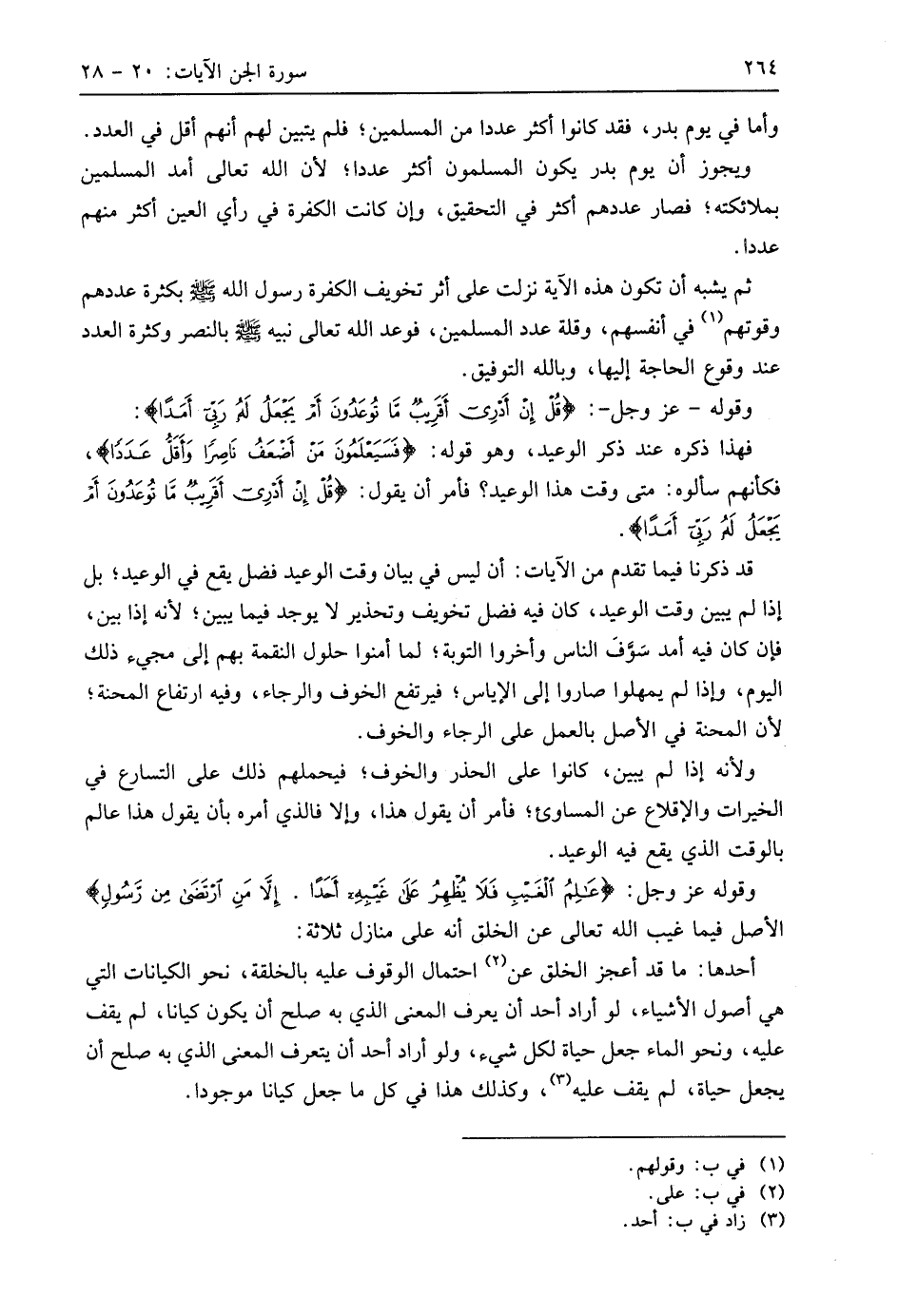 فهذا ذكره عند ذكر الوعيد، وهو قوله: (فَسَيَعْلَمُونَ مَنْ أَضْعَفُ نَاصِرًا وَأَقَلُّ عَدَدًا)، فكأنهم سألوه: متى وقت هذا الوعيد؟ فأمر أن يقول: (قُلْ إِنْ أَدْرِي أَقَرِيبٌ مَا تُوعَدُونَ أَمْ يَجْعَلُ لَهُ رَبِّي أَمَدًا).