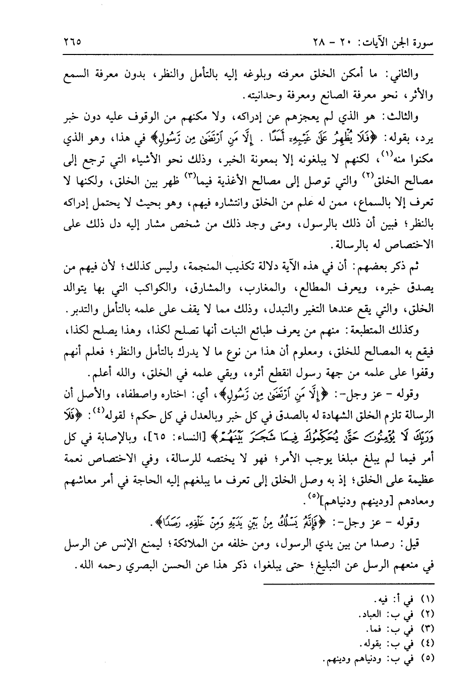 وقوله - عَزَّ وَجَلَّ -: (إِلَّا مَنِ ارْتَضَى مِنْ رَسُولٍ)، أي: اختاره واصطفاه، والأصل أن الرسالة تلزم الخلق الشهادة له بالصدق في كل خبر وبالعدل في كل حكم؛ لقوله: (فَلَا وَرَبِّكَ لَا يُؤْمِنُونَ حَتَّى يُحَكِّمُوكَ فِيمَا شَجَرَ بَيْنَهُمْ)، وبالإصابة في كل أمر فيما لم يبلغ مبلغا يوجب الأمر؛ فهو لا يختصه للرسالة، وفي الاختصاص نعمة عظيمة على الخلق؛ إذ به وصل الخلق إلى تعرف ما يبلغهم إليه الحاجة في أمر معاشهم ومعادهم ودينهم ودنياهم.