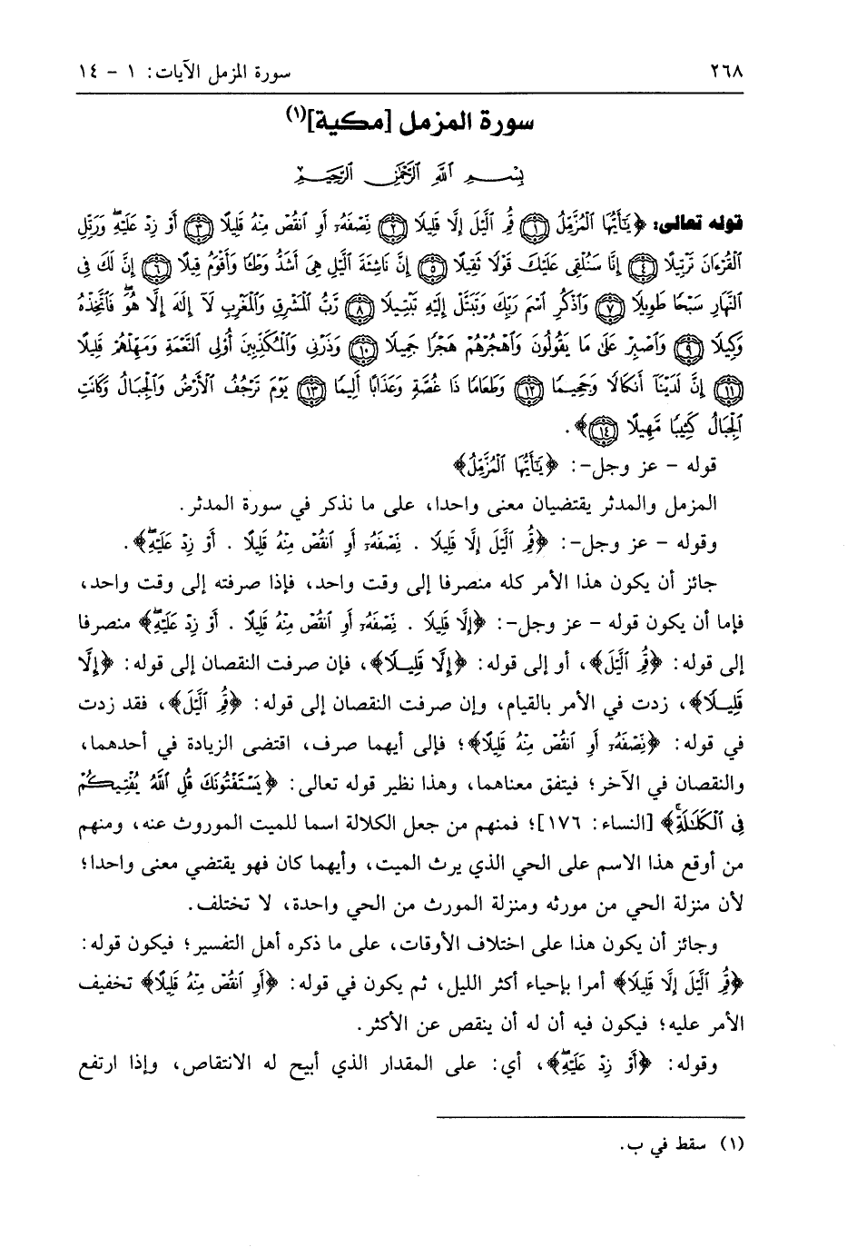 قوله تعالى (يَا أَيُّهَا الْمُزَّمِّلُ (1) قُمِ اللَّيْلَ إِلَّا قَلِيلًا (2) نِصْفَهُ أَوِ انْقُصْ مِنْهُ قَلِيلًا (3) أَوْ زِدْ عَلَيْهِ وَرَتِّلِ الْقُرْآنَ تَرْتِيلًا (4) إِنَّا سَنُلْقِي عَلَيْكَ قَوْلًا ثَقِيلًا (5) إِنَّ نَاشِئَةَ اللَّيْلِ هِيَ أَشَدُّ وَطْئًا وَأَقْوَمُ قِيلًا (6) إِنَّ لَكَ فِي النَّهَارِ سَبْحًا طَوِيلًا (7) وَاذْكُرِ اسْمَ رَبِّكَ وَتَبَتَّلْ إِلَيْهِ تَبْتِيلًا (8) رَبُّ الْمَشْرِقِ وَالْمَغْرِبِ لَا إِلَهَ إِلَّا هُوَ فَاتَّخِذْهُ وَكِيلًا (9) وَاصْبِرْ عَلَى مَا يَقُولُونَ وَاهْجُرْهُمْ هَجْرًا جَمِيلًا (10) وَذَرْنِي وَالْمُكَذِّبِينَ أُولِي النَّعْمَةِ وَمَهِّلْهُمْ قَلِيلًا (11) إِنَّ لَدَيْنَا أَنْكَالًا وَجَحِيمًا (12) وَطَعَامًا ذَا غُصَّةٍ وَعَذَابًا أَلِيمًا (13) يَوْمَ تَرْجُفُ الْأَرْضُ وَالْجِبَالُ وَكَانَتِ الْجِبَالُ كَثِيبًا مَهِيلًا (14).