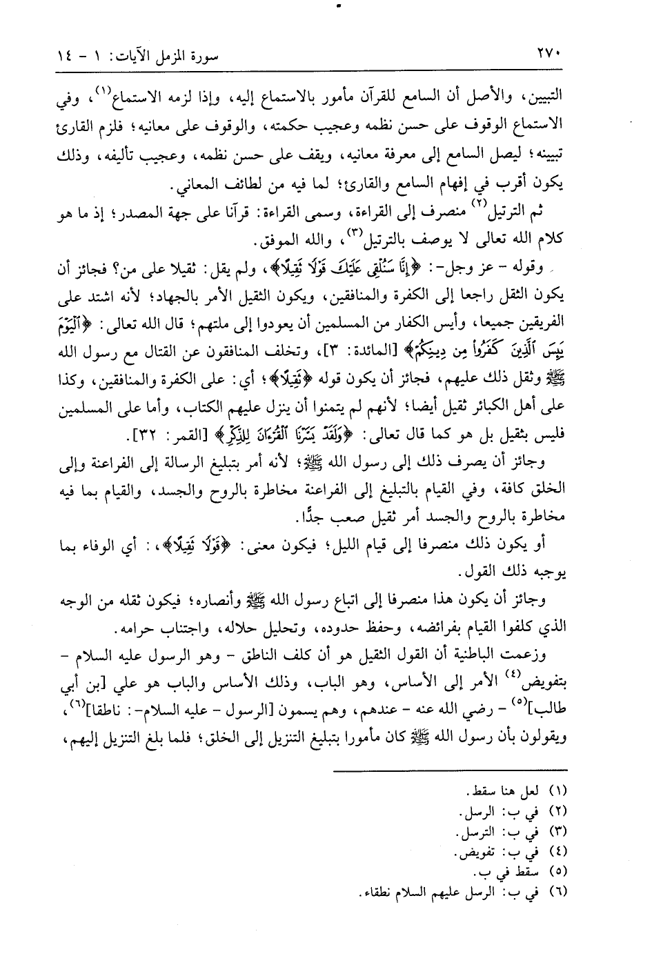 وقوله - عَزَّ وَجَلَّ -: (إِنَّا سَنُلْقِي عَلَيْكَ قَوْلًا ثَقِيلًا (5) ولم يقل: ثقيلا على من؟ فجائز أن يكون الثقل راجعا إلى الكفرة والمنافقين، ويكون الثقيل الأمر بالجهاد؛ لأنه اشتد على الفريقين جميعا، وأيس الكفار من المسلمين أن يعودوا إلى ملتهم؛ قال اللَّه تعالى: (الْيَوْمَ يَئِسَ الَّذِينَ كَفَرُوا مِنْ دِينِكُمْ)، وتخلف المنافقون عن القتال مع رسول الله - صَلَّى اللَّهُ عَلَيهِ وَسَلَّمَ - وثقل ذلك عليهم، فجائز أن يكون قوله (ثَقِيلًا)؛ أي: على الكفرة والمنافقين، وكذا على أهل الكبائر ثقيل أيضا؛ لأنهم لم يتمنوا أن ينزل عليهم الكتاب، وأما على المسلمين فليس بثقيل بل هو كما قال تعالى: (وَلَقَدْ يَسَّرْنَا الْقُرْآنَ لِلذِّكْرِ).