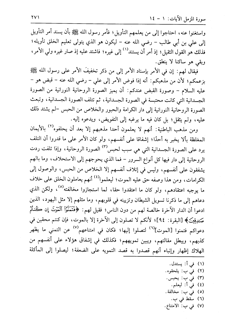 فيقال لهم: إن في الأمر بإسناد الأمر إلى من ذكر تخفيفَ الأمر على رسول اللَّه - صَلَّى اللَّهُ عَلَيهِ وَسَلَّمَ - بزعمكم؛ لأن من مذهبكم: أنه إذا فوض الأمر إلى علي - رَضِيَ اللَّهُ عَنْهُ - قبض هو - عليه السلام - وصورة القبض عندكم: أن يميز الصورة الروحانية النورانية من الصورة الجسدانية التي كانت محتبسة في الصورة الجسدانية، ثم تتلف الصورة الجسدانية، وتبعث الصورة الروحانية النورانية إلى دار الكرامة والحبور والخلاص من الحبس - لم يشتد ذلك عليه، ولم يثقل؛ بل كان فيه ما يرغبه إلى التفويض، ويدعوه إليه.