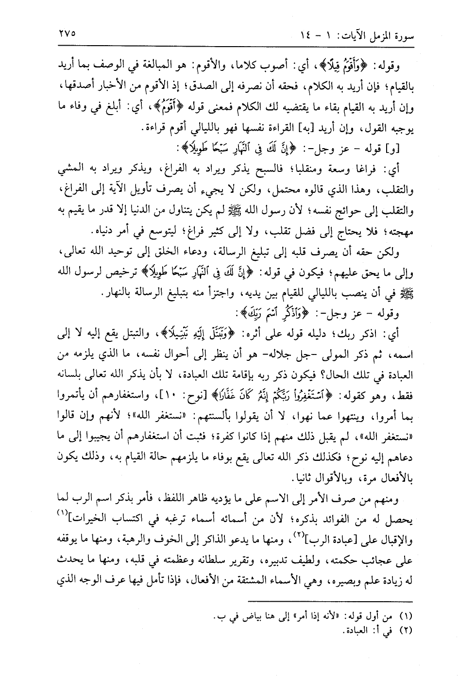 وقوله: (وَأَقْوَمُ قِيلًا)، أي: أصوب كلاما، والأقوم: هو المبالغة في الوصف بما أريد بالقيام؛ فإن أريد به الكلام، فحقه أن نصرفه إلى الصدق؛ إذ الأقوم من الأخبار أصدقها، وإن أريد به القيام بقاء ما يقتضيه لك الكلام فمعنى قوله (وَأَقْوَمُ)، أي: أبلغ في وفاء ما يوجبه القول، وإن أريد به القراءة نفسها فهو بالليالي أقوم قراءة.