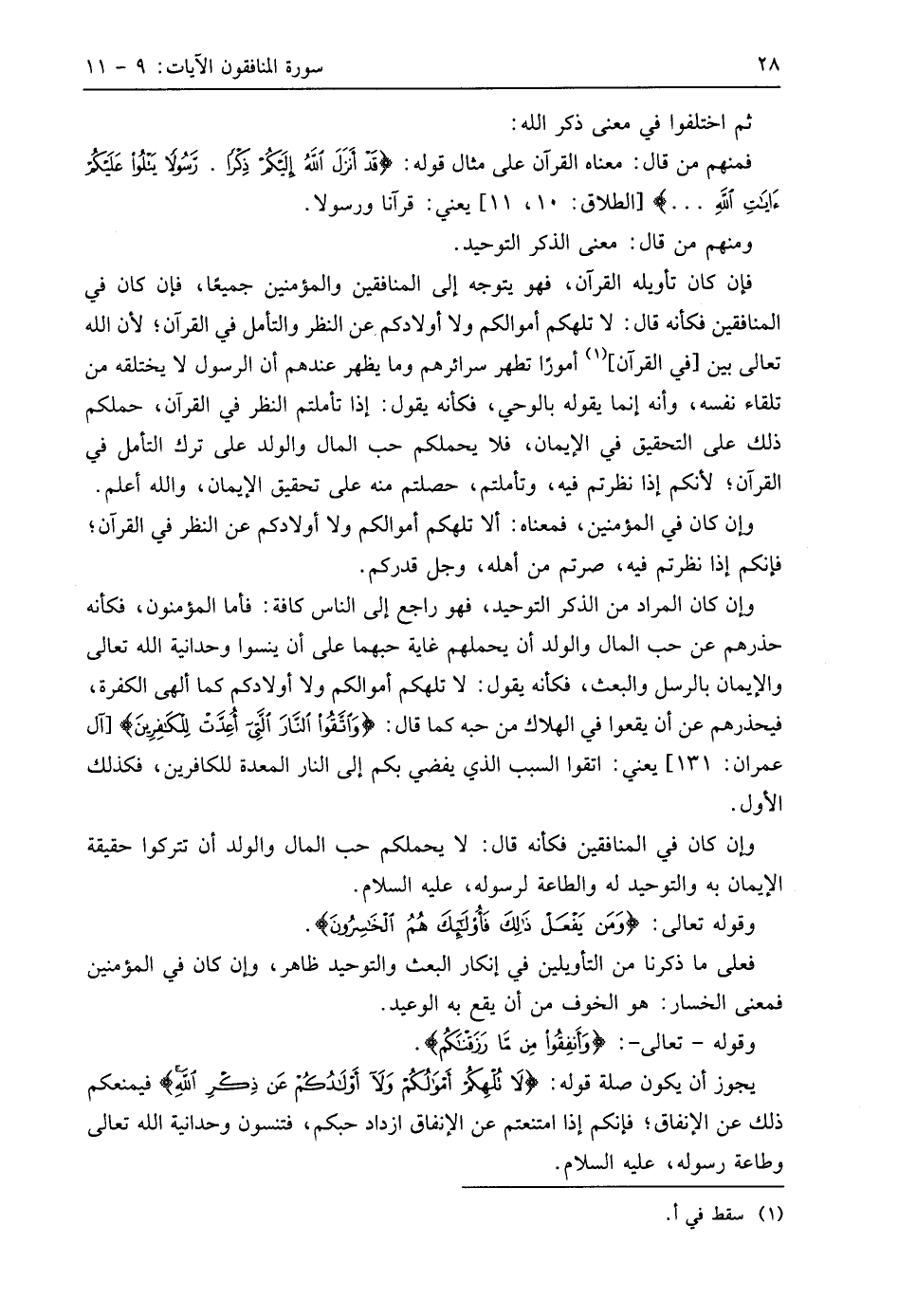 فإن كان تأويله القرآن، فهو يتوجه إلى المنافقين والمؤمنين جميعًا، فإن كان في المنافقين فكأنه قال: لا تلهكم أموالكم ولا أولادكم عن النظر والتأمل في القرآن؛ لأن الله تعالى بين في القرآن أمورًا تطهر سرائرهم وما يظهر عندهم أن الرسول لا يختلقه من تلقاء نفسه، وأنه إنما يقوله بالوحي، فكأنه يقول: إذا تأملتم النظر في القرآن، حملكم ذلك على التحقيق في الإيمان، فلا يحملكم حب المال والولد على ترك التأمل في القرآن؛ لأنكم إذا نظرتم فيه، وتأملتم، حصلتم منه على تحقيق الإيمان، واللَّه أعلم.