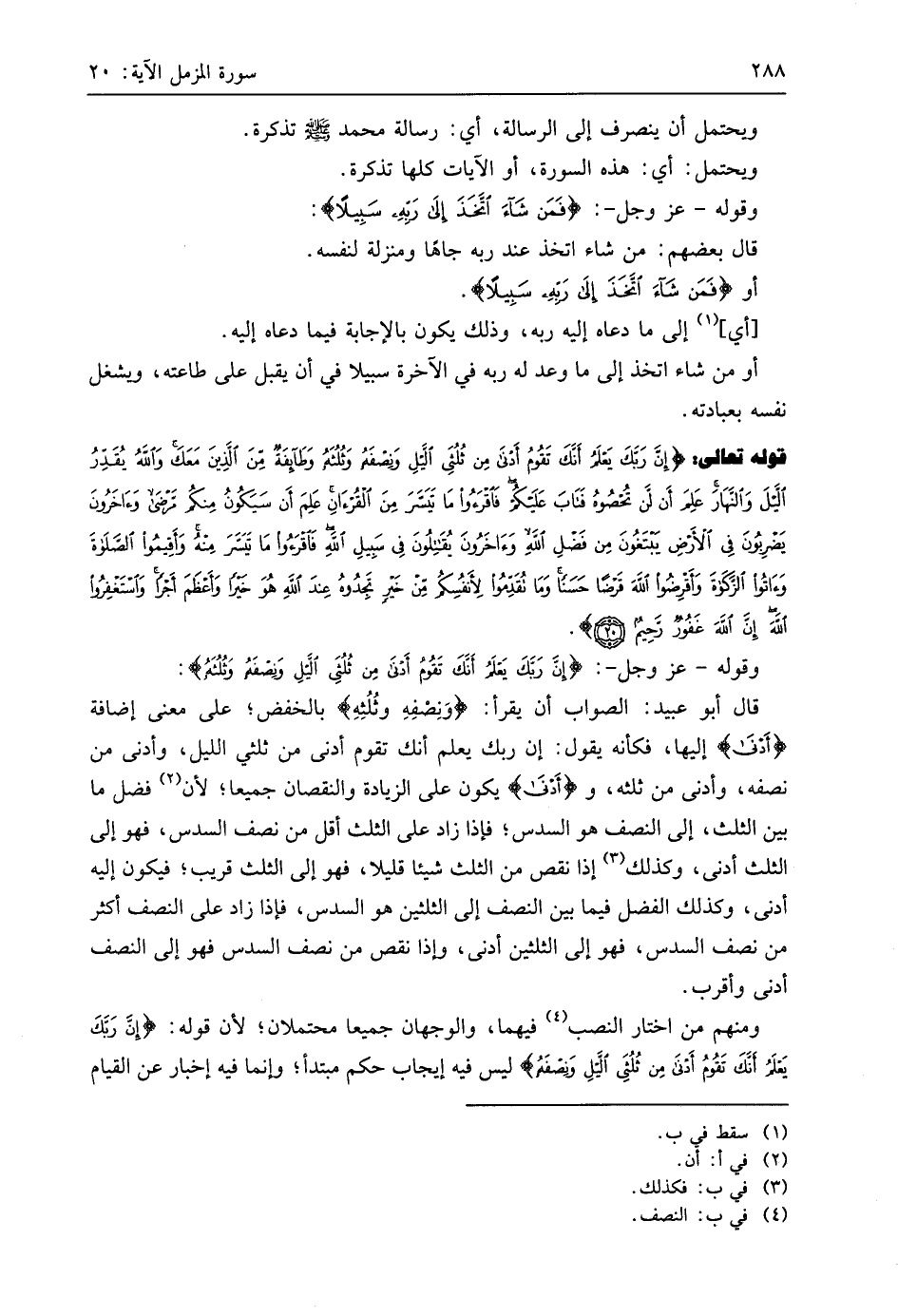ومنهم من اختار النصب فيهما، والوجهان جميعا محتملان؛ لأن قوله: (إِنَّ رَبَّكَ يَعْلَمُ أَنَّكَ تَقُومُ أَدْنَى مِنْ ثُلُثَيِ اللَّيْلِ وَنِصْفَهُ) ليس فيه إيجاب حكم مبتدأ؛ وإنما فيه إخبار عن القيام
