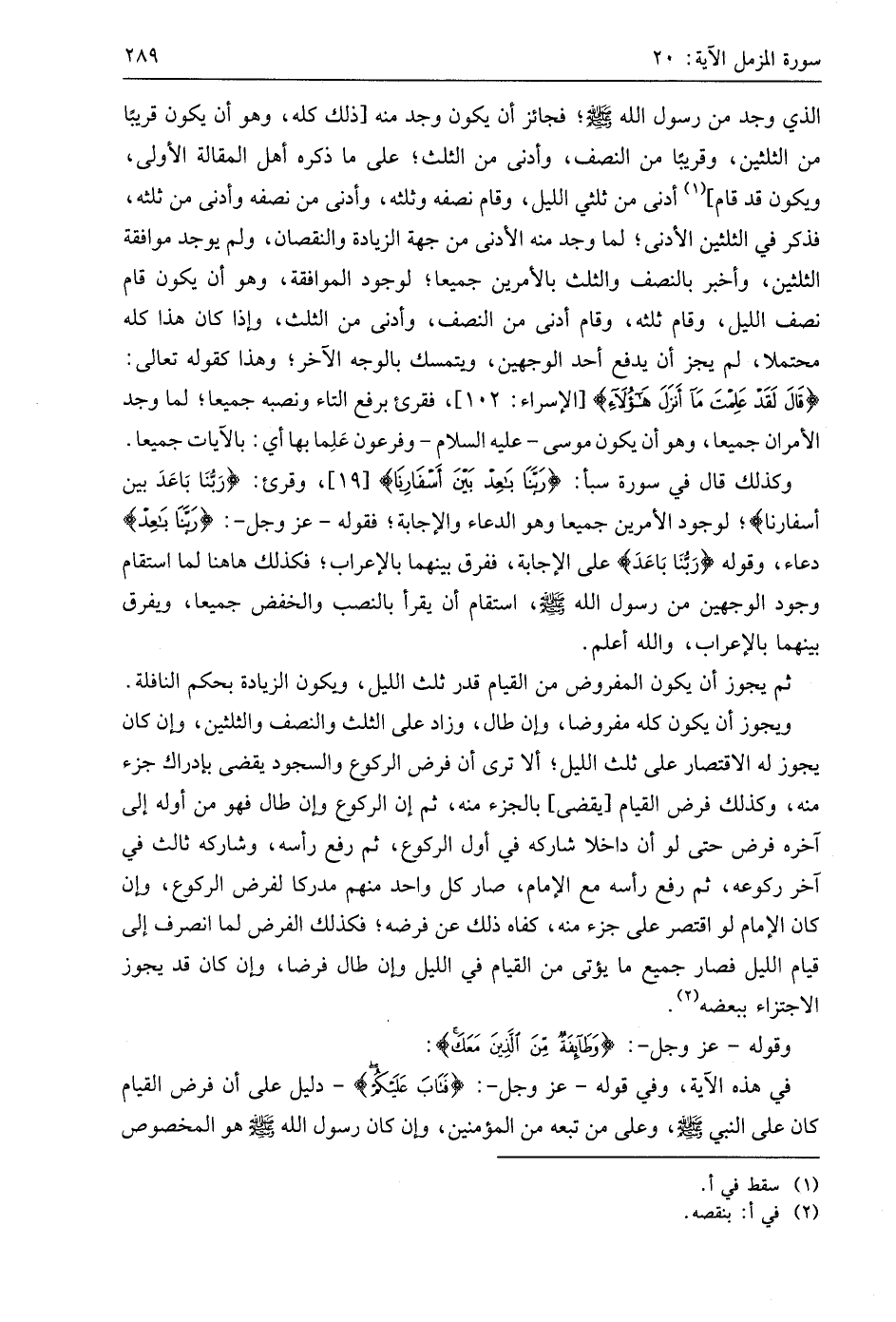 الذي وجد من رسول اللَّه - صَلَّى اللَّهُ عَلَيهِ وَسَلَّمَ -؛ فجائز أن يكون وجد منه ذلك كله، وهو أن يكون قريبًا من الثلثين، وقريبًا من النصف، وأدنى من الثلث؛ على ما ذكره أهل المقالة الأولى، ويكون قد قام أدنى من ثلثي الليل، وقام نصفه وثلثه، وأدنى من نصفه وأدنى من ثلثه، فذكر في الثلثين الأدنى؛ لما وجد منه الأدنى من جهة الزيادة والنقصان، ولم يوجد موافقة الثلثين، وأخبر بالنصف والثلث بالأمرين جميعا؛ لوجود الموافقة، وهو أن يكون قام نصف الليل، وقام ثلثه، وقام أدنى من النصف، وأدنى من الثلث، وإذا كان هذا كله محتملا، لم يجز أن يدفع أحد الوجهين، ويتمسك بالوجه الآخر؛ وهذا كقوله تعالى: (قَالَ لَقَدْ عَلِمْتَ مَا أَنْزَلَ هَؤُلَاءِ)، فقرئ برفع التاء ونصبه جميعا؛ لما وجد الأمران جميعا، وهو أن يكون موسى - عليه السلام - وفرعون عَلِما بها أي: بالآيات جميعا.