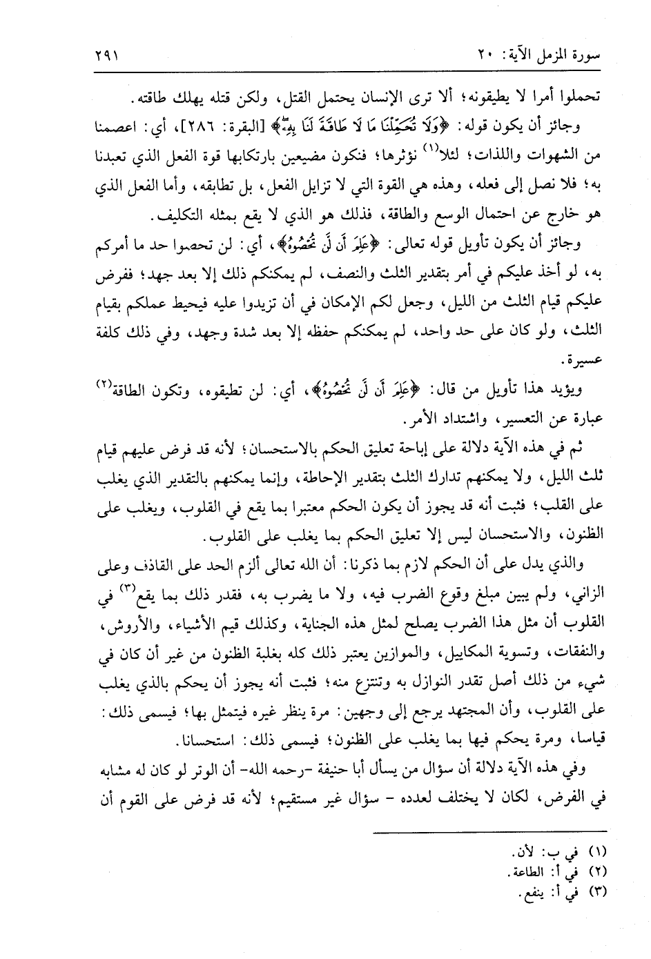 وجائز أن يكون تأويل قوله تعالى: (عَلِمَ أَنْ لَنْ تُحْصُوهُ)، أي: لن تحصوا حد ما أمركم به، لو أخذ عليكم في أمر بتقدير الثلث والنصف، لم يمكنكم ذلك إلا بعد جهد؛ ففرض عليكم قيام الثلث من الليل، وجعل لكم الإمكان في أن تزيدوا عليه فيحيط عملكم بقيام الثلث، ولو كان على حد واحد، لم يمكنكم حفظه إلا بعد شدة وجهد، وفي ذلك كلفة عسيرة.