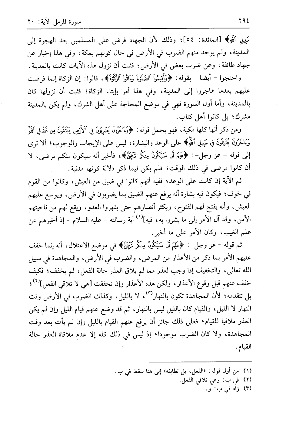 ومن ذكر أنها كلها مكية، فهو يحمل قوله: (وَآخَرُونَ يَضْرِبُونَ فِي الْأَرْضِ يَبْتَغُونَ مِنْ فَضْلِ اللَّهِ وَآخَرُونَ يُقَاتِلُونَ فِي سَبِيلِ اللَّهِ) على الوعد والبشارة، ليس على الإيجاب والوجوب؛ ألا ترى إلى قوله - عَزَّ وَجَلَّ -: (عَلِمَ أَنْ سَيَكُونُ مِنْكُمْ مَرْضَى)، فأخبر أنه سيكون منكم مرضى، لا أن كانوا مرضى في ذلك الوقت؛ فلم يكن فيما ذكر دلالة كونها مدنية.