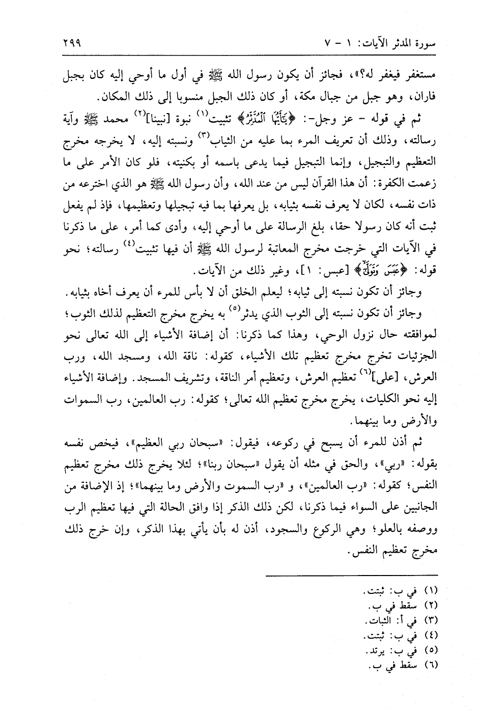 وجائز أن تكون نسبته إلى الثوب الذي يدثر به يخرج مخرج التعظيم لذلك الثوب؛ لموافقته حال نزول الوحي، وهذا كما ذكرنا: أن إضافة الأشياء إلى اللَّه تعالى نحو الجزئيات تخرج مخرج تعظيم تلك الأشياء، كقوله: ناقة اللَّه، ومسجد اللَّه، ورب العرش، على تعظيم العرش، وتعظيم أمر الناقة، وتشريف المسجد. وإضافة الأشياء إليه نحو الكليات، يخرج مخرج تعظيم اللَّه تعالى؛ كقوله: رب العالمين، رب السماوات والأرض وما بينهما.