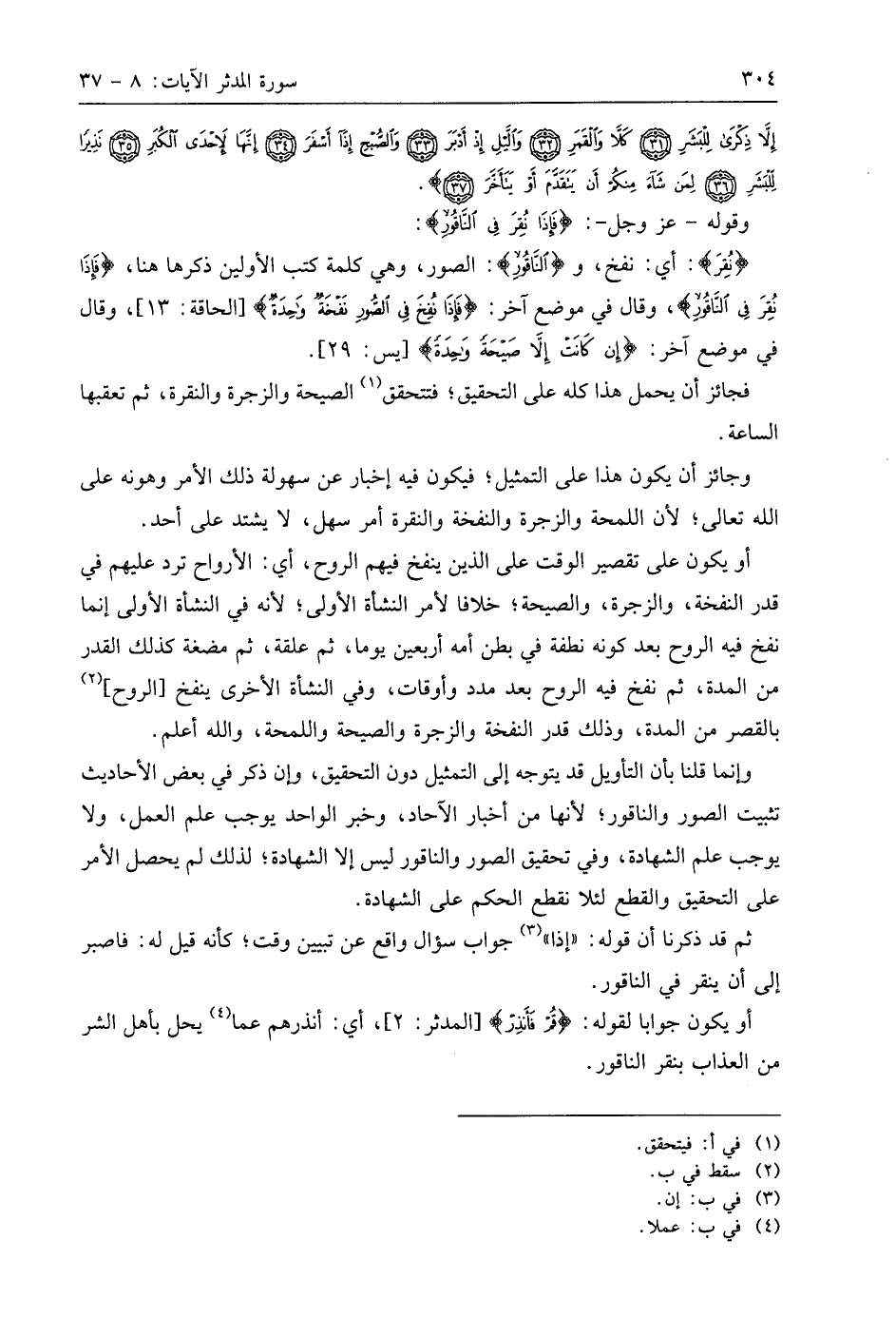 (نُقِرَ): أي: نفخ، و (النَّاقُورِ): الصور، وهي كلمة كتب الأولين ذكرها هنا، (فَإِذَا نُقِرَ فِي النَّاقُورِ)، وقال في موضع آخر: (فَإِذَا نُفِخَ فِي الصُّورِ نَفْخَةٌ وَاحِدَةٌ)، وقال في موضع آخر: (إِنْ كَانَتْ إِلَّا صَيْحَةً وَاحِدَةً).