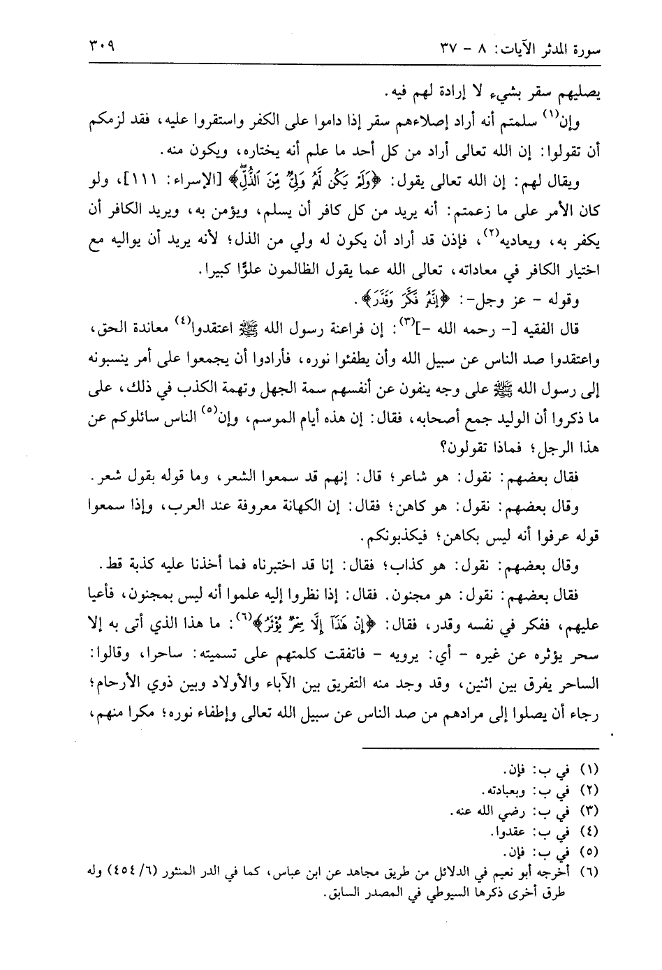 قال الفقيه - رحمه اللَّه -: إن فراعنة رسول اللَّه - صَلَّى اللَّهُ عَلَيهِ وَسَلَّمَ - اعتقدوا معاندة الحق، واعتقدوا صد الناس عن سبيل اللَّه وأن يطفئوا نوره، فأرادوا أن يجمعوا على أمر ينسبونه إلى رسول اللَّه - صَلَّى اللَّهُ عَلَيهِ وَسَلَّمَ - على وجه ينفون عن أنفسهم سمة الجهل وتهمة الكذب في ذلك، على ما ذكروا أن الوليد جمع أصحابه، فقال: إن هذه أيام الموسم، وإن الناس سائلوكم عن هذا الرجل؛ فماذا تقولون؟