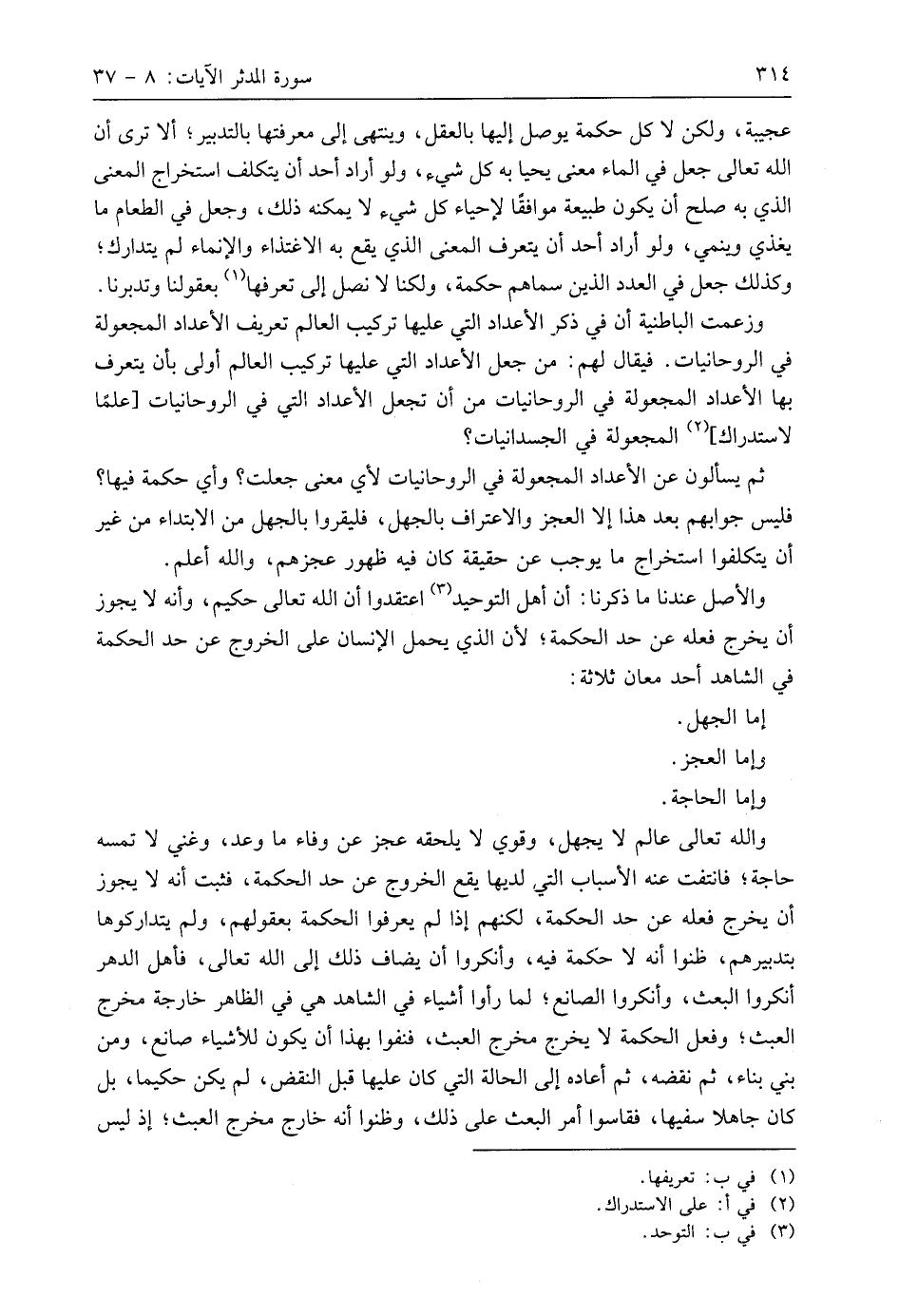 ثم يسألون عن الأعداد المجعولة في الروحانيات لأي معنى جعلت؟ وأي حكمة فيها؟ فليس جوابهم بعد هذا إلا العجز والاعتراف بالجهل، فليقروا بالجهل من الابتداء من غير أن يتكلفوا استخراج ما يوجب عن حقيقة كان فيه ظهور عجزهم، واللَّه أعلم.
