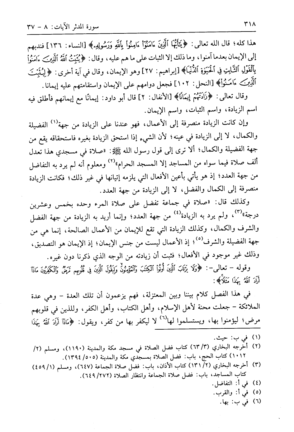 وكذلك قال: " صلاة في جماعة تفضل على صلاة المرء وحده بخمس وعشرين درجة "، ولم يرد به الزيادة من جهة العدد؛ وإنما أريد به الزيادة من جهة الفضل والشرف والكمال، وكذلك الزيادة التي تقع للإيمان من الأعمال الصالحة، إنما هي من جهة الفضيلة والشرف؛ إذ الأعمال ليست من جنس الإيمان؛ إذ الإيمان هو التصديق، وذلك غير موجود في الأفعال؛ فثبت أن زيادته من الوجه الذي ذكرنا دون غيره.