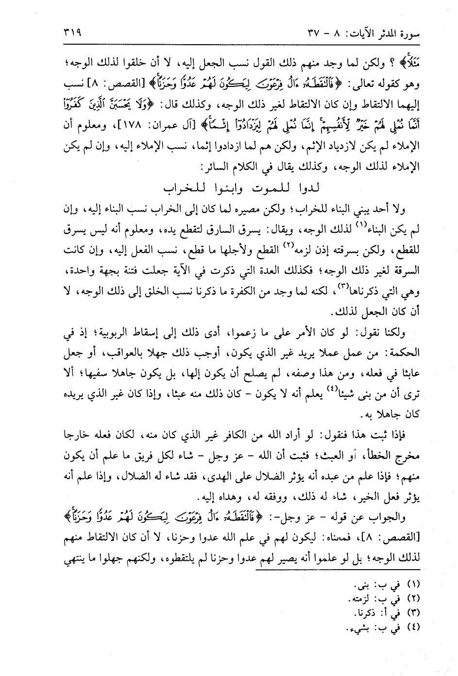 والجواب عن قوله - عَزَّ وَجَلَّ -: (فَالْتَقَطَهُ آلُ فِرْعَوْنَ لِيَكُونَ لَهُمْ عَدُوًّا وَحَزَنًا)، فمعناه: ليكون لهم في علم اللَّه عدوا وحزنا، لا أن كان الالتقاط منهم لذلك الوجه؛ بل لو علموا أنه يصير لهم عدوا وحزنا لم يلتقطوه، ولكنهم جهلوا ما ينتهي