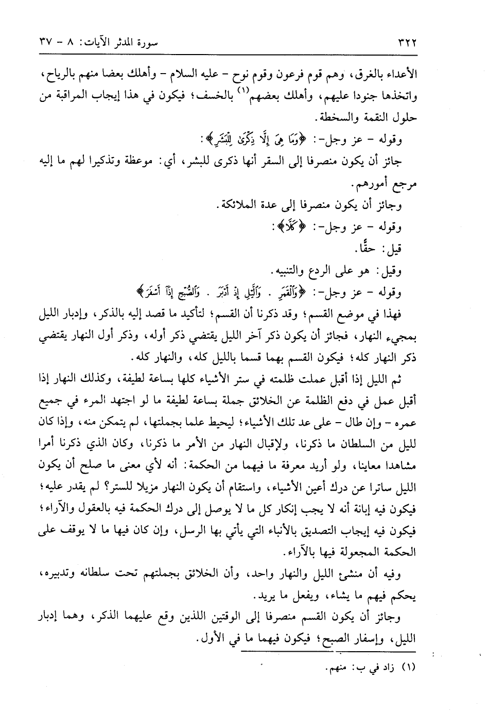 وجائز أن يكون القسم منصرفا إلى الوقتين اللذين وقع عليهما الذكر، وهما إدبار الليل، وإسفار الصبح؛ فيكون فيهما ما في الأول.