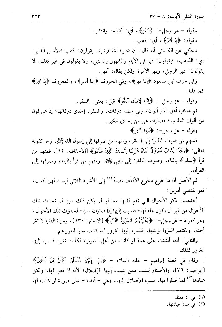 فمنهم من صرف النذارة إلى السقر، ومنهم من صرفها إلى رسول اللَّه - صَلَّى اللَّهُ عَلَيهِ وَسَلَّمَ -، وهو كقوله تعالى: (وَهَذَا كِتَابٌ مُصَدِّقٌ لِسَانًا عَرَبِيًّا لِيُنْذِرَ الَّذِينَ ظَلَمُوا)، فمنهم من قرأ (لتنذر) بالتاء، وصرف النذارة إلى النبي - صَلَّى اللَّهُ عَلَيهِ وَسَلَّمَ -. ومنهم من قرأ بالياء، وصرفها إلى القرآن.