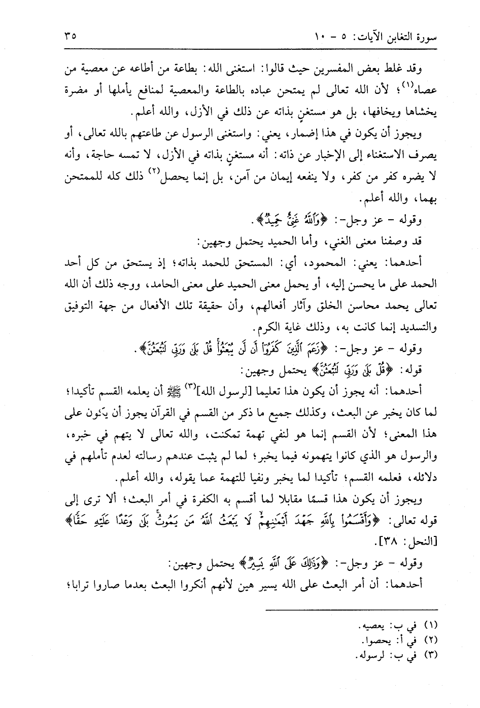 وقد غلط بعض المفسرين حيث قالوا: استغنى اللَّه: بطاعة من أطاعه عن معصية من عصاه؛ لأن اللَّه تعالى لم يمتحن عباده بالطاعة والمعصية لمنافع يأملها أو مضرة يخشاها ويخافها، بل هو مستغنٍ بذاته عن ذلك في الأزل، واللَّه أعلم.