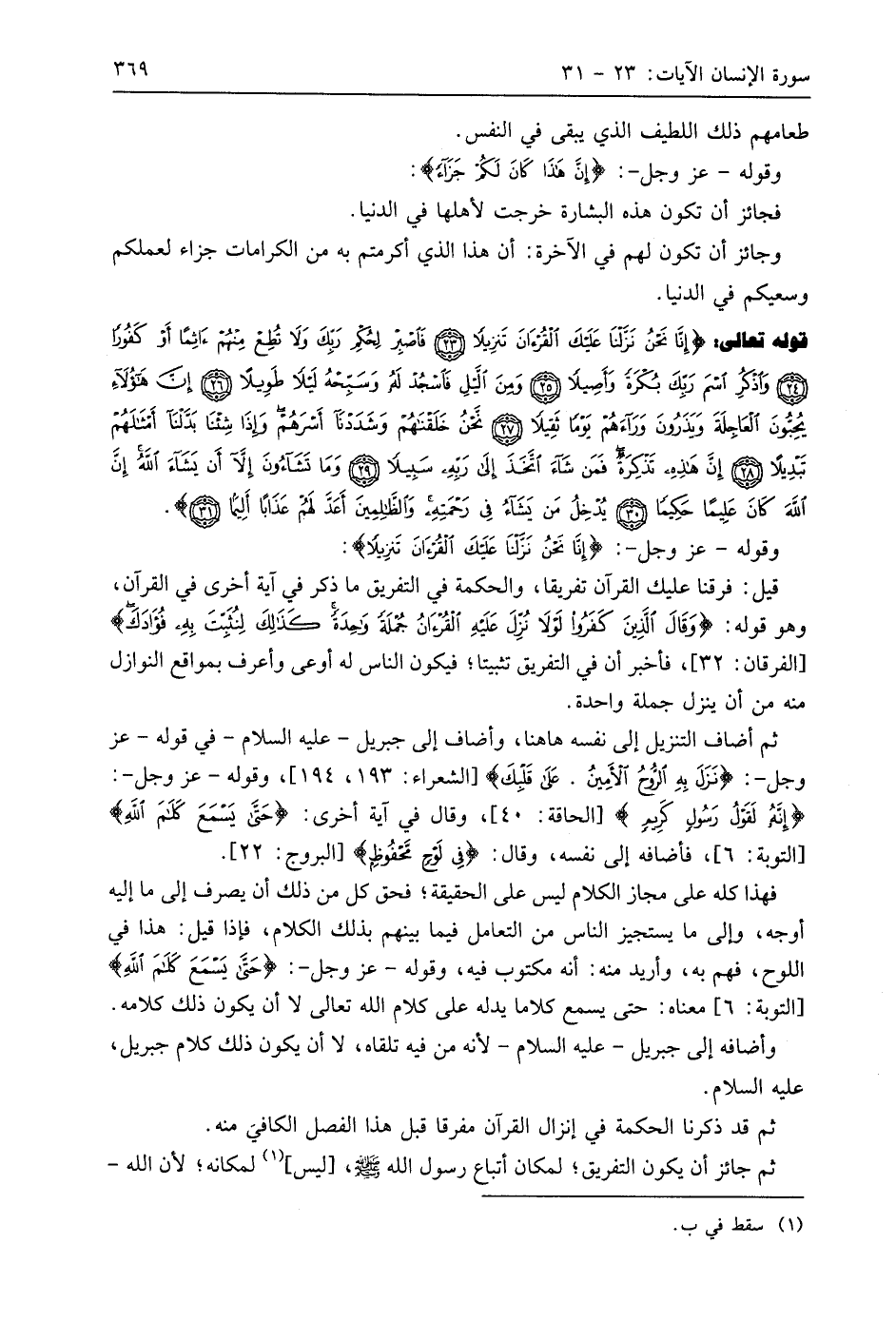 قوله تعالى (إِنَّا نَحْنُ نَزَّلْنَا عَلَيْكَ الْقُرْآنَ تَنْزِيلًا (23) فَاصْبِرْ لِحُكْمِ رَبِّكَ وَلَا تُطِعْ مِنْهُمْ آثِمًا أَوْ كَفُورًا (24) وَاذْكُرِ اسْمَ رَبِّكَ بُكْرَةً وَأَصِيلًا (25) وَمِنَ اللَّيْلِ فَاسْجُدْ لَهُ وَسَبِّحْهُ لَيْلًا طَوِيلًا (26) إِنَّ هَؤُلَاءِ يُحِبُّونَ الْعَاجِلَةَ وَيَذَرُونَ وَرَاءَهُمْ يَوْمًا ثَقِيلًا (27) نَحْنُ خَلَقْنَاهُمْ وَشَدَدْنَا أَسْرَهُمْ وَإِذَا شِئْنَا بَدَّلْنَا أَمْثَالَهُمْ تَبْدِيلًا (28) إِنَّ هَذِهِ تَذْكِرَةٌ فَمَنْ شَاءَ اتَّخَذَ إِلَى رَبِّهِ سَبِيلًا (29) وَمَا تَشَاءُونَ إِلَّا أَنْ يَشَاءَ اللَّهُ إِنَّ اللَّهَ كَانَ عَلِيمًا حَكِيمًا (30) يُدْخِلُ مَنْ يَشَاءُ فِي رَحْمَتِهِ وَالظَّالِمِينَ أَعَدَّ لَهُمْ عَذَابًا أَلِيمًا (31).