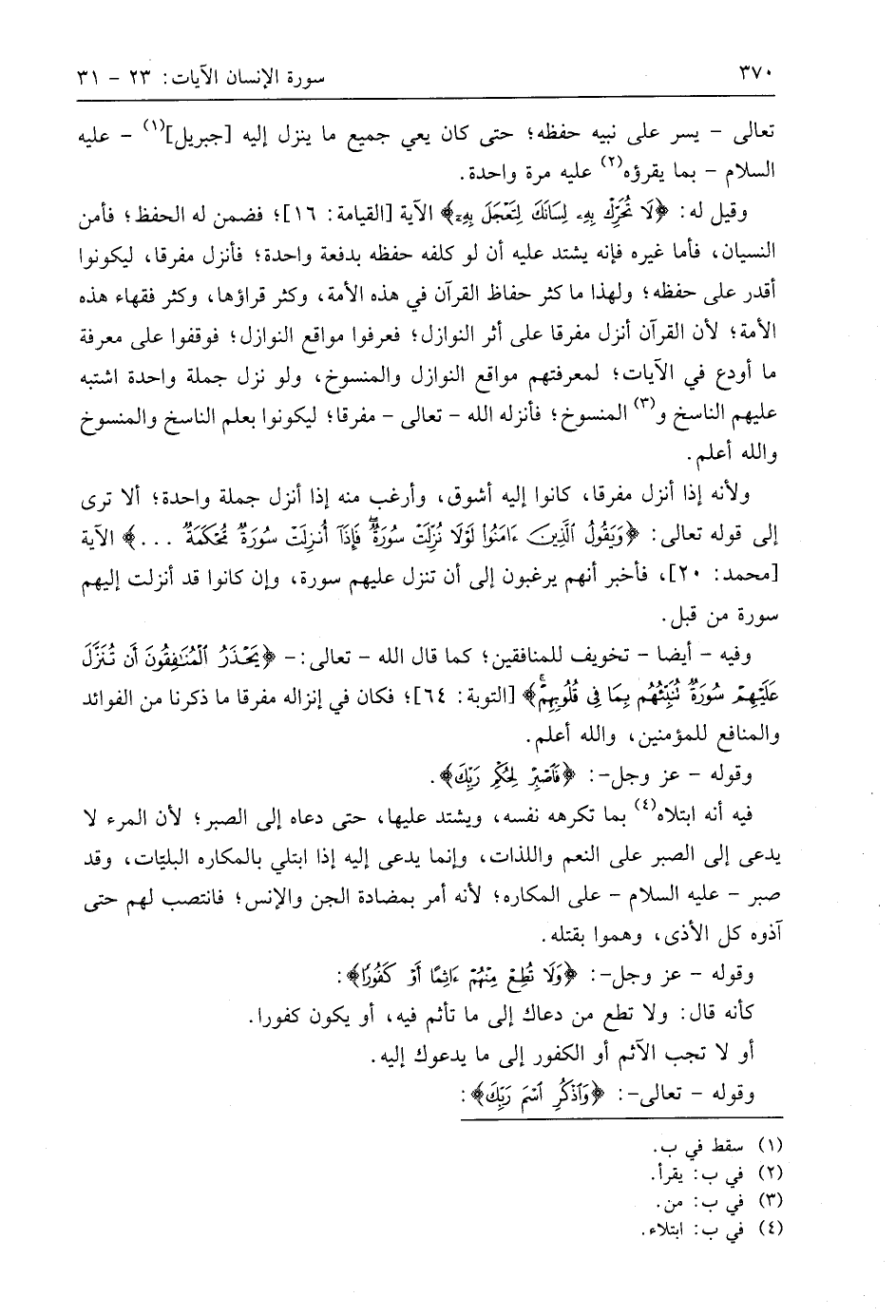 وقيل له: (لَا تُحَرِّكْ بِهِ لِسَانَكَ لِتَعْجَلَ بِهِ) الآية؛ فضمن له الحفظ؛ فأمن النسيان، فأما غيره فإنه يشتد عليه أن لو كلفه حفظه بدفعة واحدة؛ فأنزل مفرقا، ليكونوا أقدر على حفظه؛ ولهذا ما كثر حفاظ القرآن في هذه الأمة، وكثر قراؤها، وكثر فقهاء هذه الأمة؛ لأن القرآن أنزل مفرقا على أثر النوازل؛ فعرفوا مواقع النوازل؛ فوقفوا على معرفة ما أودع في الآيات؛ لمعرفتهم مواقع النوازل والمنسوخ، ولو نزل جملة واحدة اشتبه عليهم الناسخ والمنسوخ؛ فأنزله اللَّه - تعالى - مفرقا؛ ليكونوا بعلم الناسخ والمنسوخ واللَّه أعلم.
