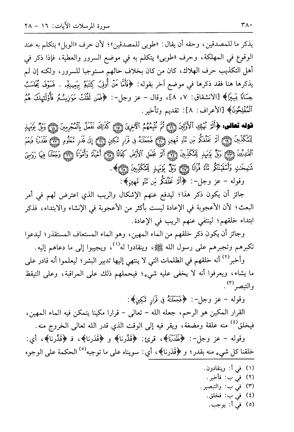 قوله تعالى: (أَلَمْ نُهْلِكِ الْأَوَّلِينَ (16) ثُمَّ نُتْبِعُهُمُ الْآخِرِينَ (17) كَذَلِكَ نَفْعَلُ بِالْمُجْرِمِينَ (18) وَيْلٌ يَوْمَئِذٍ لِلْمُكَذِّبِينَ (19) أَلَمْ نَخْلُقْكُمْ مِنْ مَاءٍ مَهِينٍ. فَجَعَلْنَاهُ فِي قَرَارٍ مَكِينٍ. إِلَى قَدَرٍ مَعْلُومٍ (22) فَقَدَرْنَا فَنِعْمَ الْقَادِرُونَ. وَيْلٌ يَوْمَئِذٍ لِلْمُكَذِّبِينَ (24) أَلَمْ نَجْعَلِ الْأَرْضَ كِفَاتًا (25) أَحْيَاءً وَأَمْوَاتًا (26) وَجَعَلْنَا فِيهَا رَوَاسِيَ شَامِخَاتٍ وَأَسْقَيْنَاكُمْ مَاءً فُرَاتًا (27) وَيْلٌ يَوْمَئِذٍ لِلْمُكَذِّبِينَ (28).