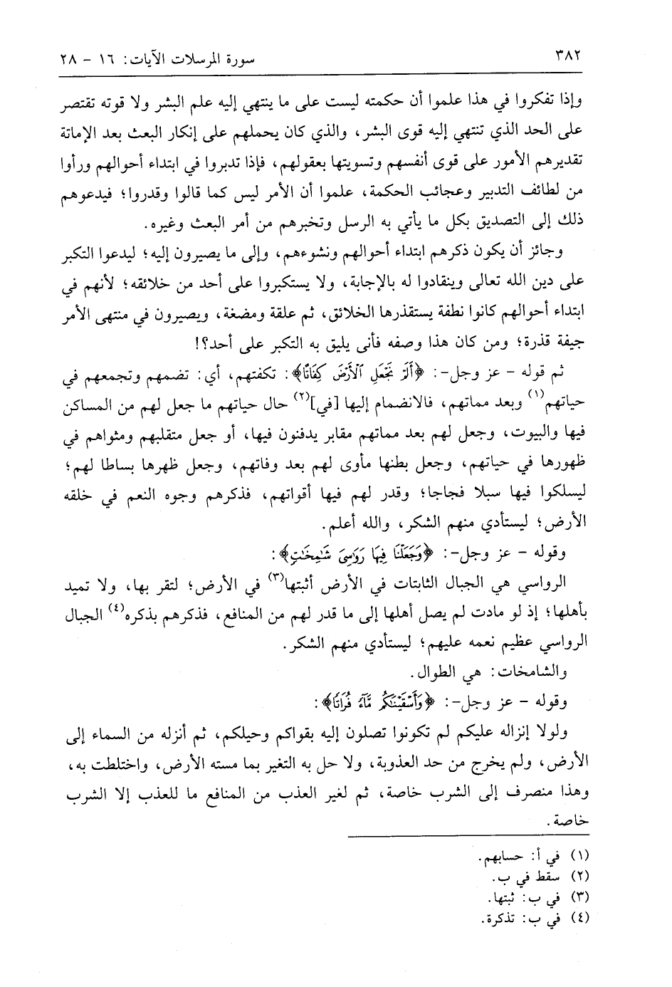 ثم قوله - عَزَّ وَجَلَّ -: (أَلَمْ نَجْعَلِ الْأَرْضَ كِفَاتًا): تكفتهم، أي: تضمهم وتجمعهم في حياتهم وبعد مماتهم، فالانضمام إليها في حال حياتهم ما جعل لهم من المساكن فيها والبيوت، وجعل لهم بعد مماتهم مقابر يدفنون فيها، أو جعل متقلبهم ومثواهم في ظهورها في حياتهم، وجعل بطنها مأوى لهم بعد وفاتهم، وجعل ظهرها بساطا لهم؛ ليسلكوا فيها سبلا فجاجا؛ وقدر لهم فيها أقواتهم، فذكرهم وجوه النعم في خلقه الأرض؛ ليستأدي منهم الشكر، واللَّه أعلم.