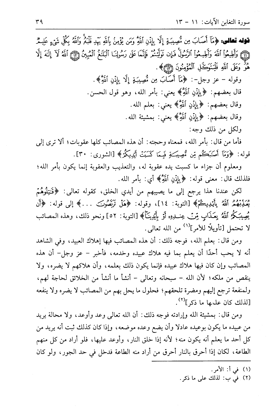 قوله تعالى: (مَا أَصَابَ مِنْ مُصِيبَةٍ إِلَّا بِإِذْنِ اللَّهِ وَمَنْ يُؤْمِنْ بِاللَّهِ يَهْدِ قَلْبَهُ وَاللَّهُ بِكُلِّ شَيْءٍ عَلِيمٌ (11) وَأَطِيعُوا اللَّهَ وَأَطِيعُوا الرَّسُولَ فَإِنْ تَوَلَّيْتُمْ فَإِنَّمَا عَلَى رَسُولِنَا الْبَلَاغُ الْمُبِينُ (12) اللَّهُ لَا إِلَهَ إِلَّا هُوَ وَعَلَى اللَّهِ فَلْيَتَوَكَّلِ الْمُؤْمِنُونَ (13).
