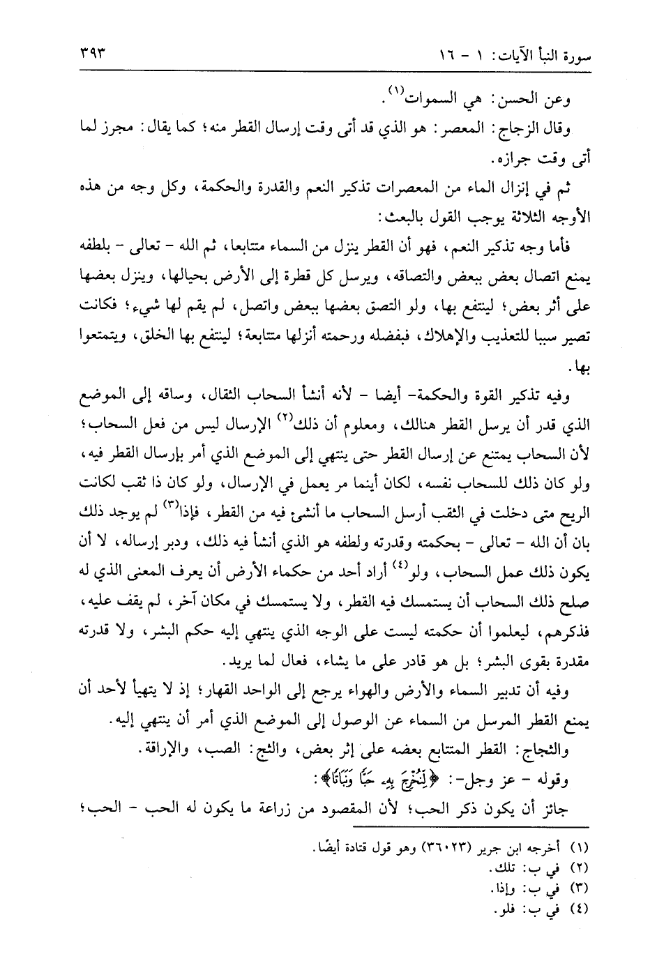ثم في إنزال الماء من المعصرات تذكير النعم والقدرة والحكمة، وكل وجه من هذه الأوجه الثلاثة يوجب القول بالبعث: