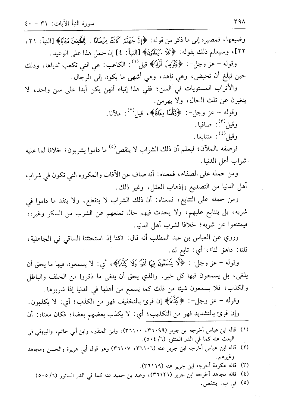 وقوله - عَزَّ وَجَلَّ -: (لَا يَسْمَعُونَ فِيهَا لَغْوًا وَلَا كِذَّابًا (35) أي: لا يسمعون فيها ما يحق أن يلغى، بل يسمعون فيها كل خير، والذي يحق أن يلغى ما ذكروا من الحلف والباطل والكذب؛ فلا يسمعون شيئا من ذلك كما يسمع من أهلها في الدنيا إذا شربوها.