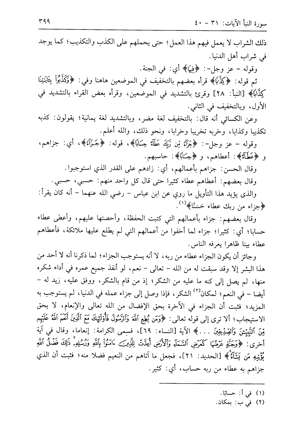 وقَالَ بَعْضُهُمْ: جزاء بأعمالهم التي كتبت الحفظة، وأحصتها عليهم، وأعطى عطاء حسابا؛ أي: كثيرا؛ جزاء لما أخفوا من أعمالهم التي لم يطلع عليها ملائكة، فأعطاهم عطاء بينا ظاهرا يعرفه الناس.