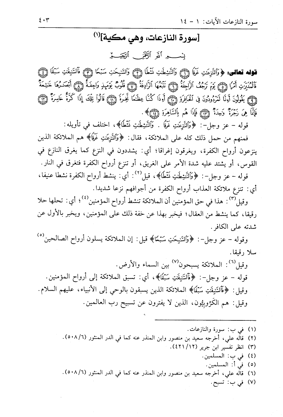 قوله - عَزَّ وَجَلَّ -: (وَالنَّازِعَاتِ غَرْقًا (1) وَالنَّاشِطَاتِ نَشْطًا)، اختلف في تأويله: