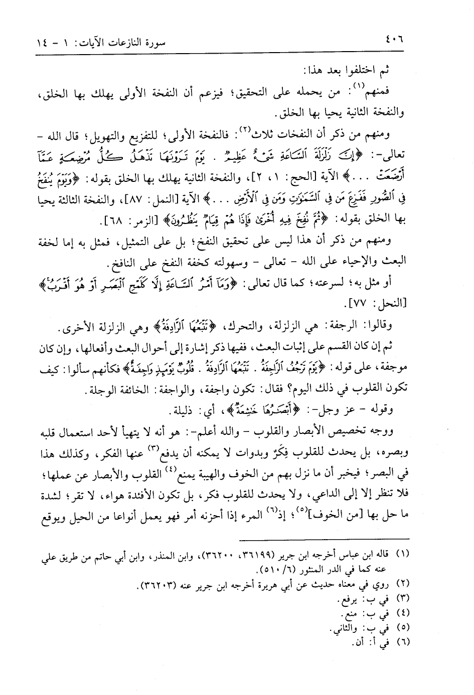 ومنهم من ذكر أن النفخات ثلاث: فالنفخة الأولى؛ للتفزيع والتهويل؛ قال اللَّه - تعالى -: (إِنَّ زَلْزَلَةَ السَّاعَةِ شَيْءٌ عَظِيمٌ (1) يَوْمَ تَرَوْنَهَا تَذْهَلُ كُلُّ مُرْضِعَةٍ عَمَّا أَرْضَعَتْ. . .) الآية، والنفخة الثانية يهلك بها الخلق بقوله: (وَيَوْمَ يُنْفَخُ فِي الصُّورِ فَفَزِعَ مَنْ فِي السَّمَاوَاتِ وَمَنْ فِي الْأَرْضِ. . .) الآية، والنفخة الثالثة يحيا بها الخلق بقوله: (ثُمَّ نُفِخَ فِيهِ أُخْرَى فَإِذَا هُمْ قِيَامٌ يَنْظُرُونَ).