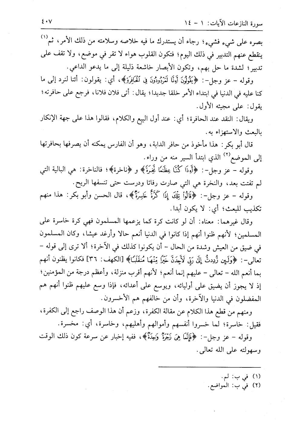 وقوله - عَزَّ وَجَلَّ -: (قَالُوا تِلْكَ إِذًا كَرَّةٌ خَاسِرَةٌ (12) قال الحسن وأبو بكر: هذا منهم تكذيب البعث؛ أي: لا يكون أبدا.
