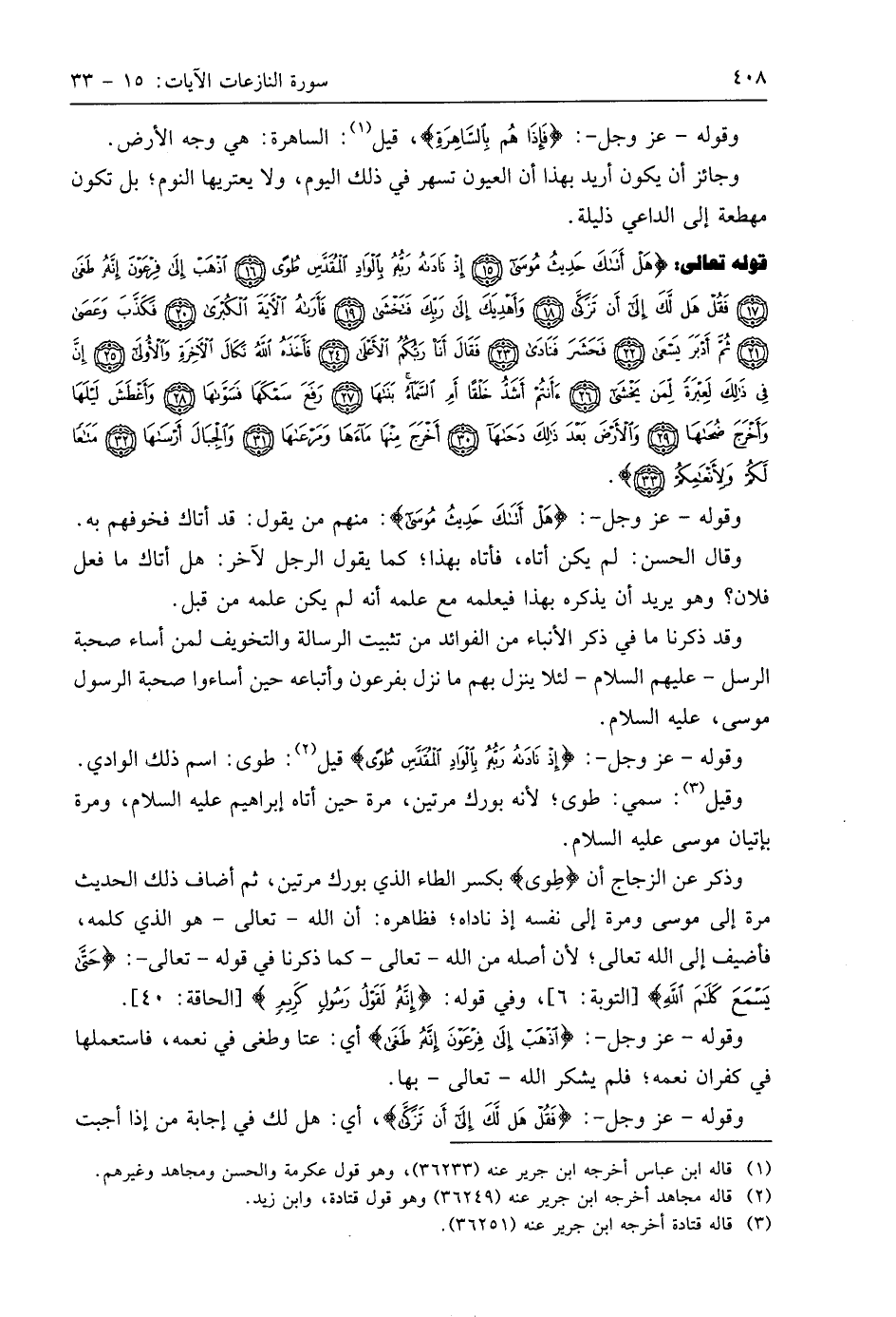 قوله تعالى: (هَلْ أَتَاكَ حَدِيثُ مُوسَى (15) إِذْ نَادَاهُ رَبُّهُ بِالْوَادِ الْمُقَدَّسِ طُوًى. اذْهَبْ إِلَى فِرْعَوْنَ إِنَّهُ طَغَى. فَقُلْ هَلْ لَكَ إِلَى أَنْ تَزَكَّى. وَأَهْدِيَكَ إِلَى رَبِّكَ فَتَخْشَى (19) فَأَرَاهُ الْآيَةَ الْكُبْرَى (20) فَكَذَّبَ وَعَصَى (21) ثُمَّ أَدْبَرَ يَسْعَى (22) فَحَشَرَ فَنَادَى (23) فَقَالَ أَنَا رَبُّكُمُ الْأَعْلَى (24) فَأَخَذَهُ اللَّهُ نَكَالَ الْآخِرَةِ وَالْأُولَى (25) إِنَّ فِي ذَلِكَ لَعِبْرَةً لِمَنْ يَخْشَى (26) أَأَنْتُمْ أَشَدُّ خَلْقًا أَمِ السَّمَاءُ بَنَاهَا (27) رَفَعَ سَمْكَهَا فَسَوَّاهَا (28) وَأَغْطَشَ لَيْلَهَا وَأَخْرَجَ ضُحَاهَا (29) وَالْأَرْضَ بَعْدَ ذَلِكَ دَحَاهَا (30) أَخْرَجَ مِنْهَا مَاءَهَا وَمَرْعَاهَا (31) وَالْجِبَالَ أَرْسَاهَا (32) مَتَاعًا لَكُمْ وَلِأَنْعَامِكُمْ (33).