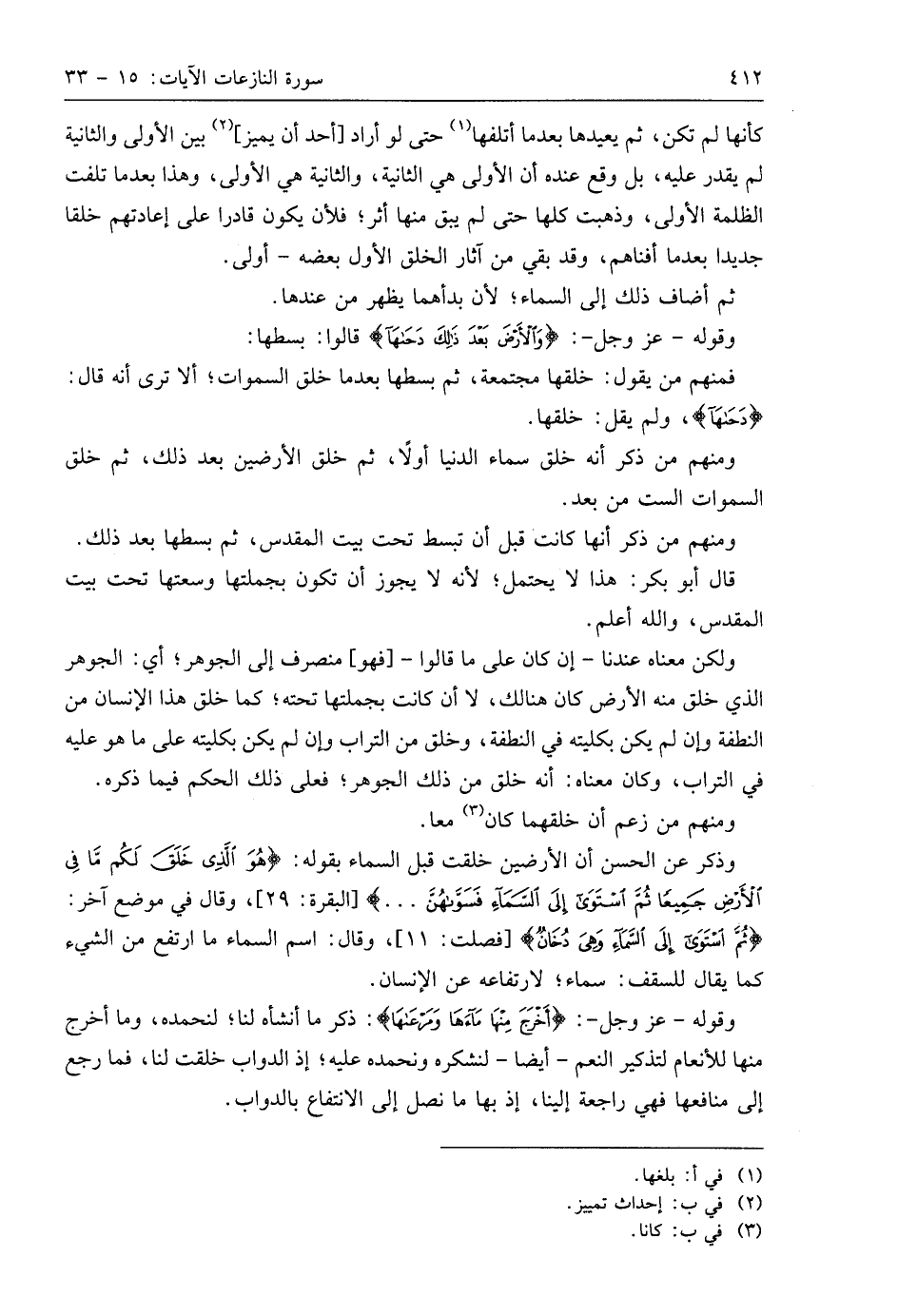 فمنهم من يقول: خلقها مجتمعة، ثم بسطها بعدما خلق السماوات؛ ألا ترى أنه قال: (دَحَاهَا)، ولم يقل: خلقها.