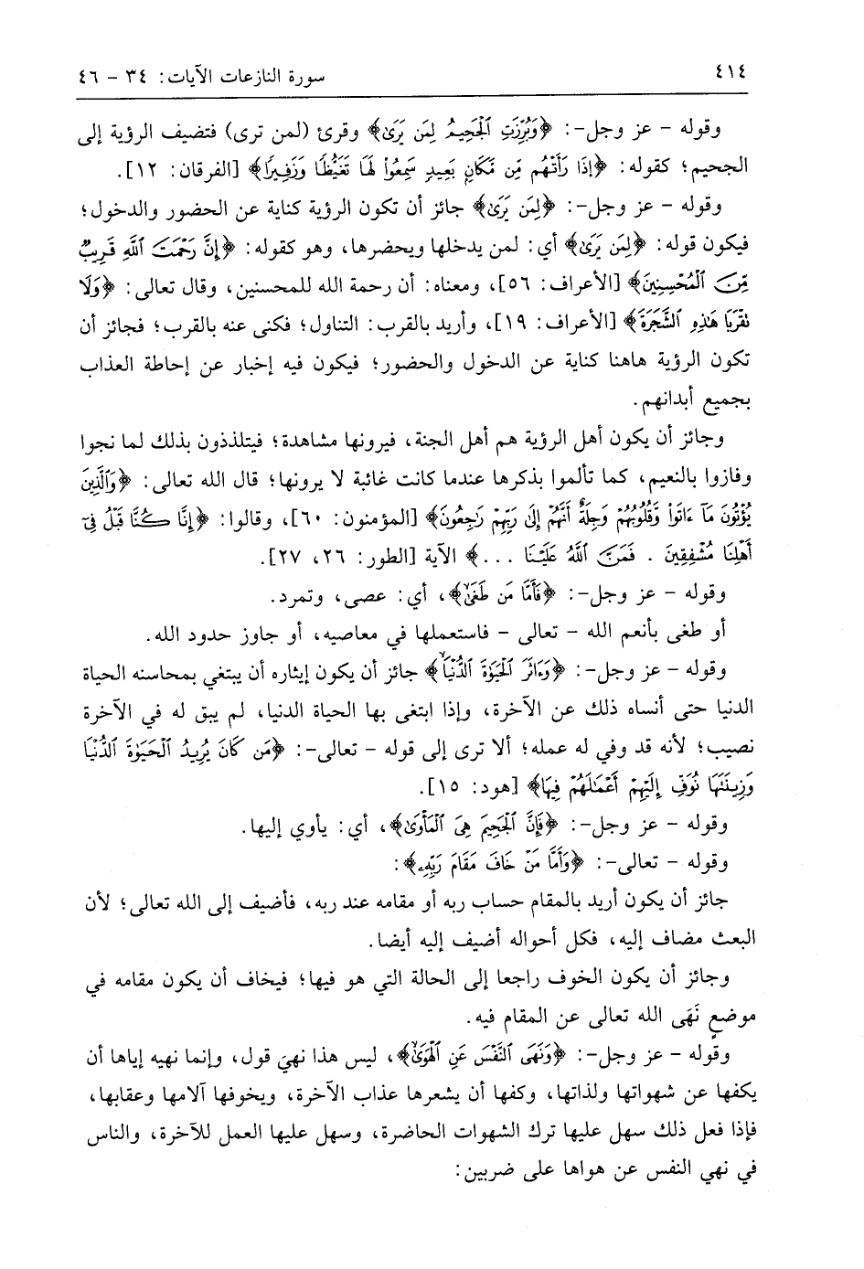 وقوله - عَزَّ وَجَلَّ -: (وَنَهَى النَّفْسَ عَنِ الْهَوَى)، ليس هذا نهيَ قول، وإنما نهيه إياها أن يكفها عن شهواتها ولذاتها، وكفها أن يشعرها عذاب الآخرة، ويخوفها آلامها وعقابها، فإذا فعل ذلك سهل عليها ترك الشهوات الحاضرة، وسهل عليها العمل للآخرة، والناس في نهي النفس عن هواها على ضربين: