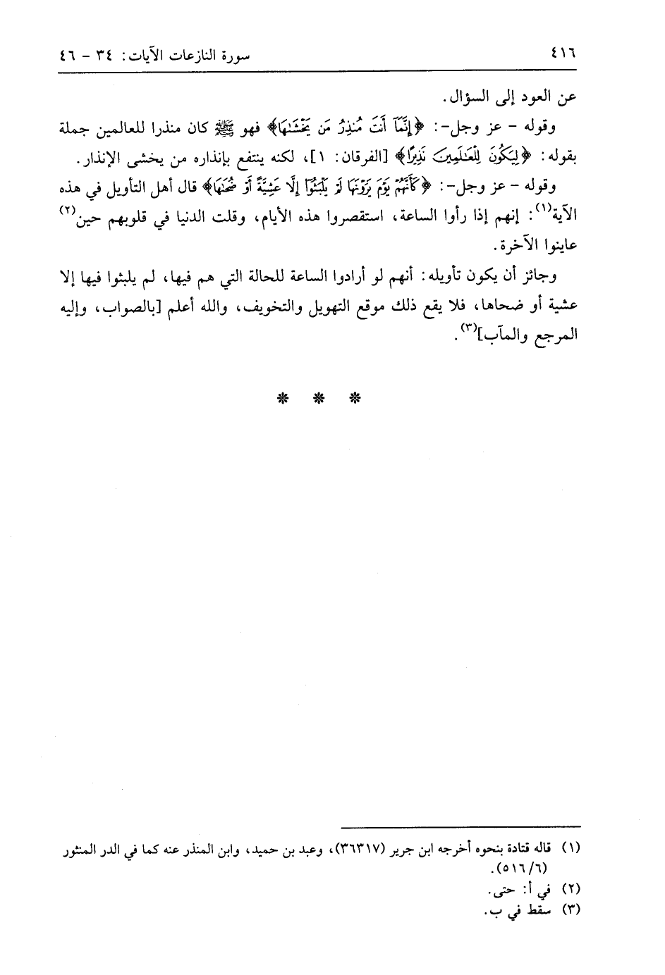 وقوله - عَزَّ وَجَلَّ -: (كَأَنَّهُمْ يَوْمَ يَرَوْنَهَا لَمْ يَلْبَثُوا إِلَّا عَشِيَّةً أَوْ ضُحَاهَا (46) قال أهل التأويل في هذه الآية: إنهم إذا رأوا الساعة، استقصروا هذه الأيام، وقلت الدنيا في قلوبهم حين عاينوا الآخرة.