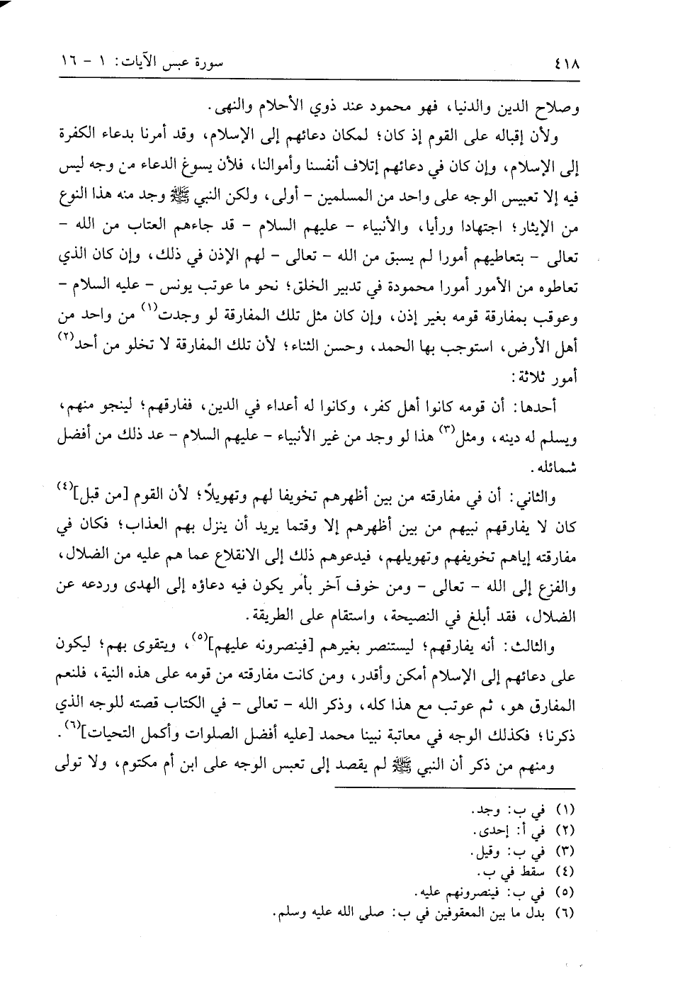 ولأن إقباله على القوم إذ كان؛ لمكان دعائهم إلى الإسلام، وقد أمرنا بدعاء الكفرة إلى الإسلام، وإن كان في دعائهم إتلاف أنفسنا وأموالنا، فلأن يسوغ الدعاء من وجه ليس فيه إلا تعبيس الوجه على واحد من المسلمين - أولى، ولكن النبي - صَلَّى اللَّهُ عَلَيهِ وَسَلَّمَ - وجد منه هذا النوع من الإيثار؛ اجتهادا ورأيا، والأنبياء - عليهم السلام - قد جاءهم العتاب من اللَّه - تعالى - بتعاطيهم أمورا لم يسبق من اللَّه - تعالى - لهم الإذن في ذلك، وإن كان الذي تعاطوه من الأمور أمورا محمودة في تدبير الخلق؛ نحو ما عوتب يونس - عليه السلام - وعوقب بمفارقة قومه بغير إذن، وإن كان مثل تلك المفارقة لو وجدت من واحد من أهل الأرض، استوجب بها الحمد، وحسن الثناء؛ لأن تلك المفارقة لا تخلو من أحد أمور ثلاثة: