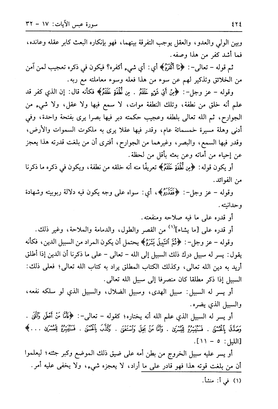 وقوله - عَزَّ وَجَلَّ -: (مِنْ أَيِّ شَيْءٍ خَلَقَهُ (18) مِنْ نُطْفَةٍ خَلَقَهُ ... (19) فكأنه قال: إن الذي كفر قد علم أنه خلق من نطفة، وتلك النطفة موات، لا سمع فيها ولا عقل، ولا شيء من الجوارح، ثم اللَّه تعالى بلطفه وعجيب حكمته دبر فيها بصرا يرى بفتحة واحدة، وفي أدنى وهلة مسيرة خمسمائة عام، وقدر فيها عقلا يرى به ملكوت السماوات والأرض، وقدر فيها السمع، والبصر، وغيرهما من الجوارح، أفترى أن من بلغت قدرته هذا يعجز عن إحياء من أماته وعن بعثه بأقل من لحظة.