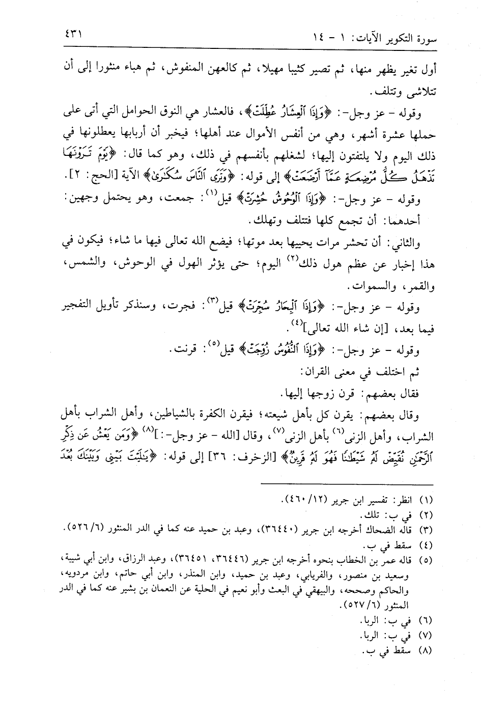 وقوله - عَزَّ وَجَلَّ -: (وَإِذَا الْعِشَارُ عُطِّلَتْ (4) فالعشار هي النوق الحوامل التي أتى على حملها عشرة أشهر، وهي من أنفس الأموال عند أهلها؛ فيخبر أن أربابها يعطلونها في ذلك اليوم ولا يلتفتون إليها؛ لشغلهم بأنفسهم في ذلك، وهو كما قال: (يَوْمَ تَرَوْنَهَا تَذْهَلُ كُلُّ مُرْضِعَةٍ عَمَّا أَرْضَعَتْ) إلى قوله: (وَتَرَى النَّاسَ سُكَارَى) الآية.