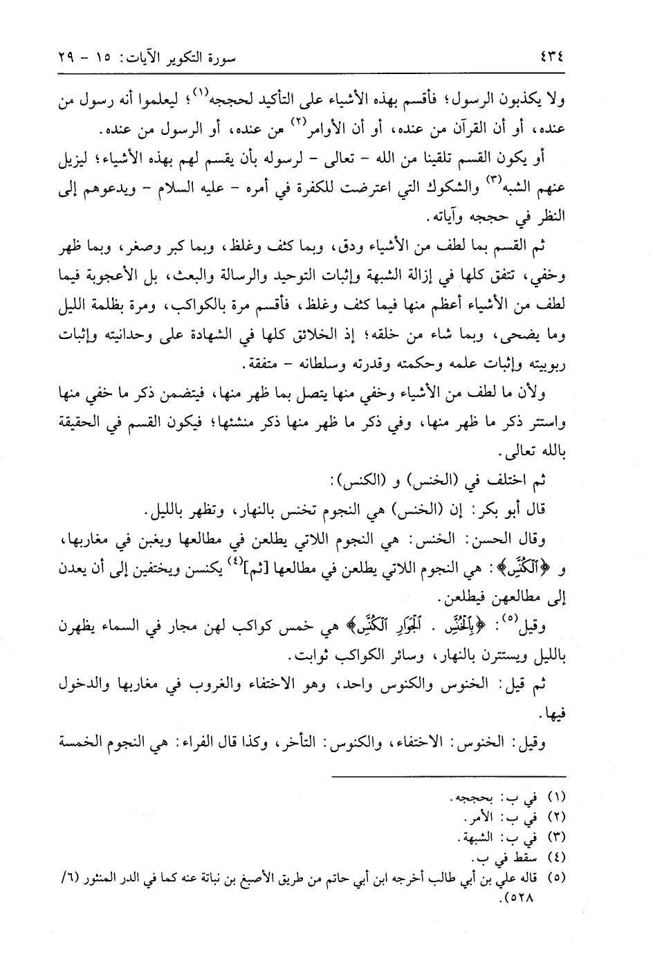 وقيل: (بِالْخُنَّسِ. الْجَوَارِ الْكُنَّسِ) وهي خمس كواكب لهن مجار في السماء يظهرن بالليل ويستترن بالنهار، وسائر الكواكب ثوابت.
