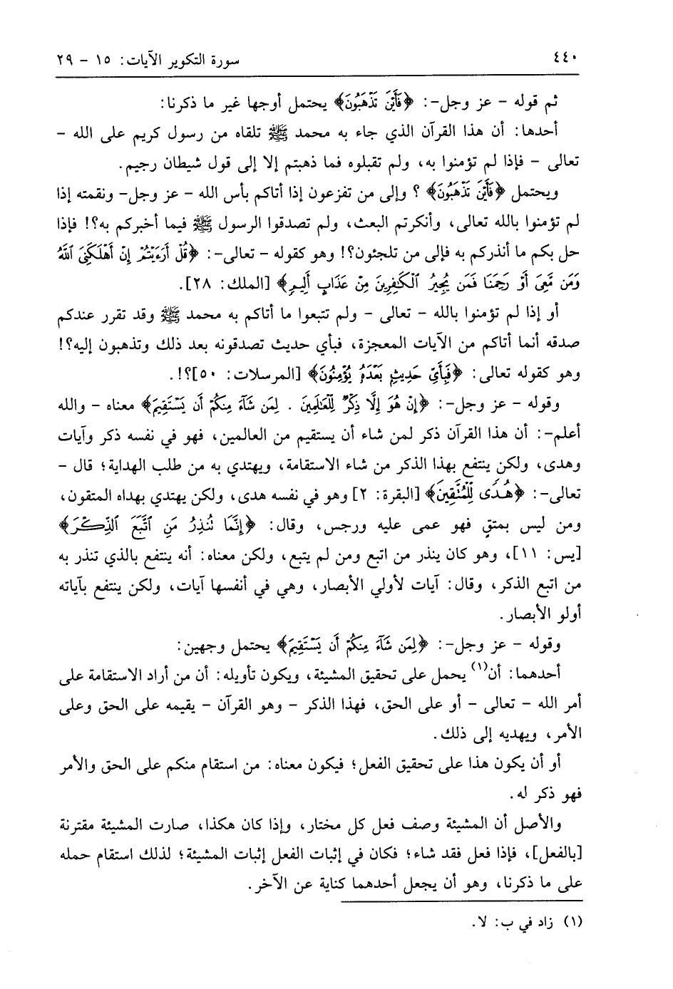 أحدهما: أن يحمل على تحقيق المشيئة، ويكون تأويله: أن من أراد الاستقامة على أمر اللَّه - تعالى - أو على الحق، فهذا الذكر -وهو القرآن- يقيمه على الحق وعلى الأمر، ويهديه إلى ذلك.