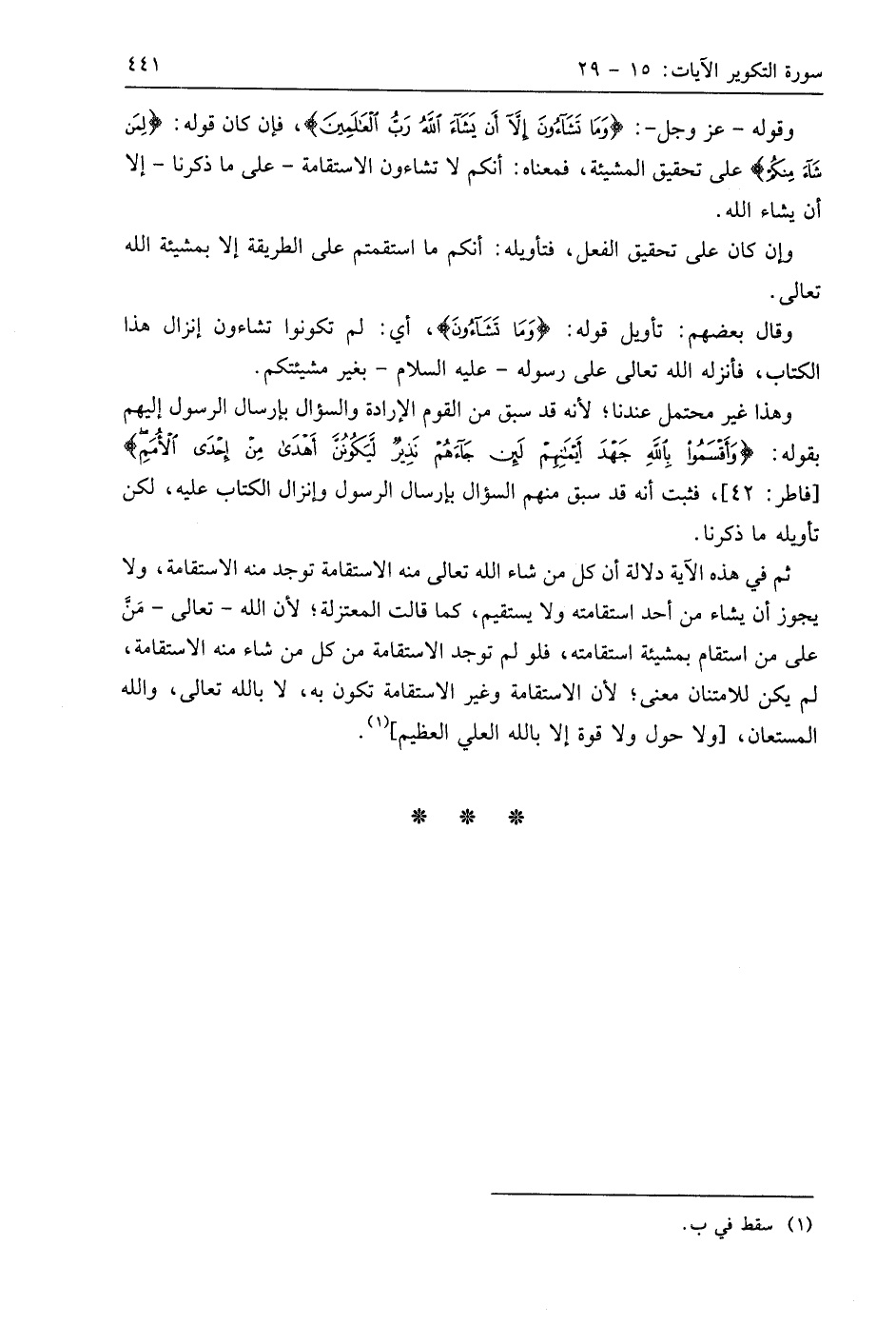 وقوله - عَزَّ وَجَلَّ -: (وَمَا تَشَاءُونَ إِلَّا أَنْ يَشَاءَ اللَّهُ رَبُّ الْعَالَمِينَ (29) فإن كان قوله: (لِمَنْ شَاءَ مِنْكُمْ) على تحقيق المشيئة، فمعناه: أنكم لا تشاءون الاستقامة -على ما ذكرنا- إلا أن يشاء اللَّه.