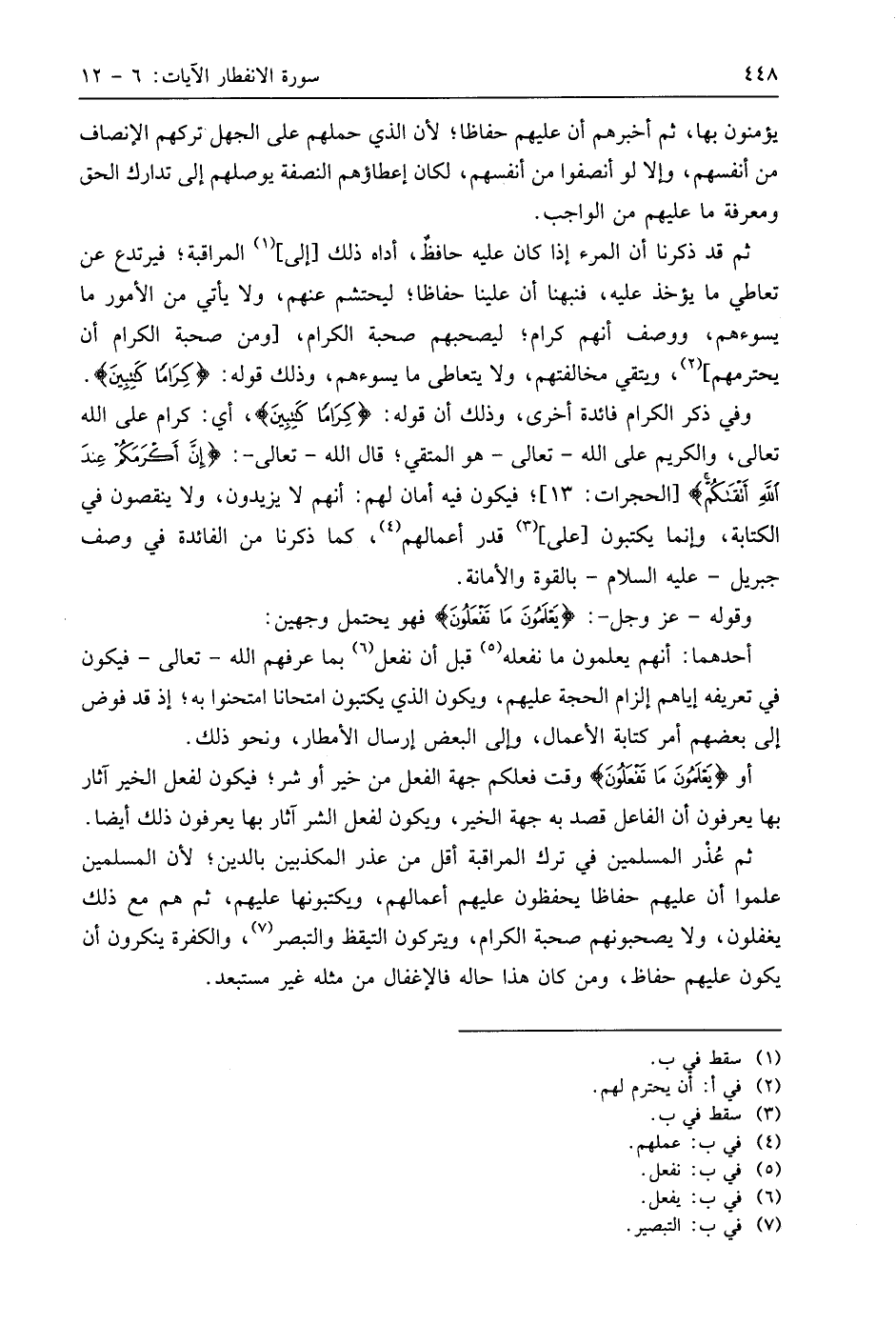 ثم قد ذكرنا أن المرء إذا كان عليه حافظٌ، أداه ذلك إلى المراقبة؛ فيرتدع عن تعاطي ما يؤخذ عليه، فنبهنا أن علينا حفاظا؛ ليحتشم عنهم، ولا يأتي من الأمور ما يسوءهم، ووصف أنهم كرام؛ ليصحبهم صحبة الكرام، ومن صحبة الكرام أن يحترمهم، ويتقي مخالفتهم، ولا يتعاطى ما يسوءهم، وذلك قوله: (كِرَامًا كَاتِبِينَ (11).