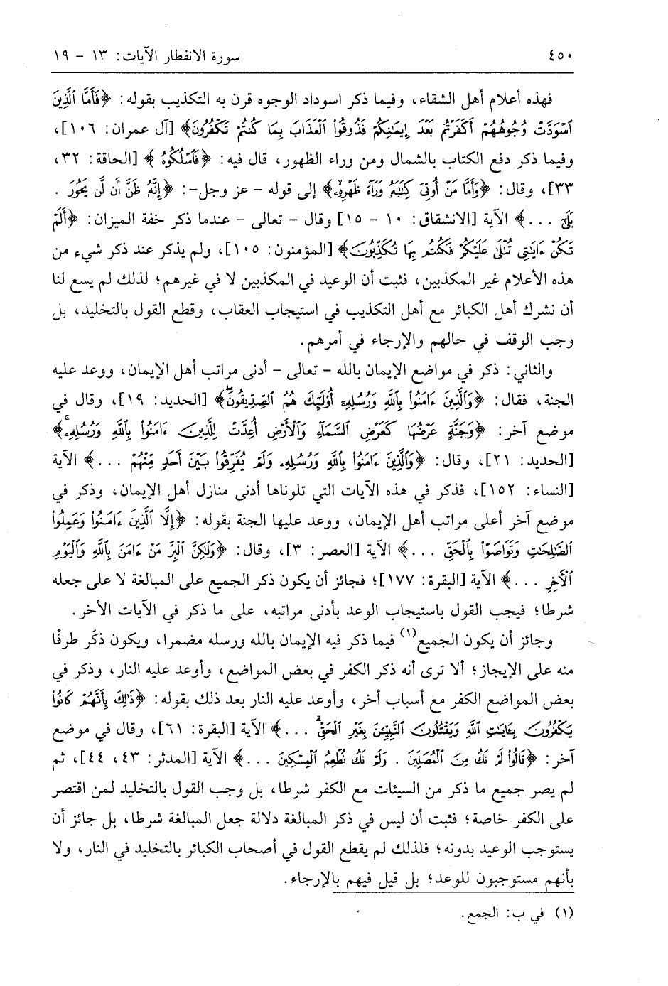 فهذه أعلام أهل الشقاء، وفيما ذكر اسوداد الوجوه قرن به التكذيب بقوله: (فَأَمَّا الَّذِينَ اسْوَدَّتْ وُجُوهُهُمْ أَكَفَرْتُمْ بَعْدَ إِيمَانِكُمْ فَذُوقُوا الْعَذَابَ بِمَا كُنْتُمْ تَكْفُرُونَ)، وفيما ذكر دفع الكتاب بالشمال ومن وراء الظهور، قال فيه: (فَاسْلُكُوهُ)،، وقال: (وَأَمَّا مَنْ أُوتِيَ كِتَابَهُ وَرَاءَ ظَهْرِهِ) إلى قوله - عَزَّ وَجَلَّ -: (إِنَّهُ ظَنَّ أَنْ لَنْ يَحُورَ. بَلَى. . .) الآية، وقال - تعالى - عندما ذكر خفة الميزان: (أَلَمْ تَكُنْ آيَاتِي تُتْلَى عَلَيْكُمْ فَكُنْتُمْ بِهَا تُكَذِّبُونَ)، ولم يذكر عند ذكر شيء من هذه الأعلام غير المكذبين، فثبت أن الوعيد في المكذبين لا في غيرهم؛ لذلك لم يسع لنا أن نشرك أهل الكبائر مع أهل التكذيب في استيجاب العقاب، وقطع القول بالتخليد، بل وجب الوقف في حالهم والإرجاء في أمرهم.