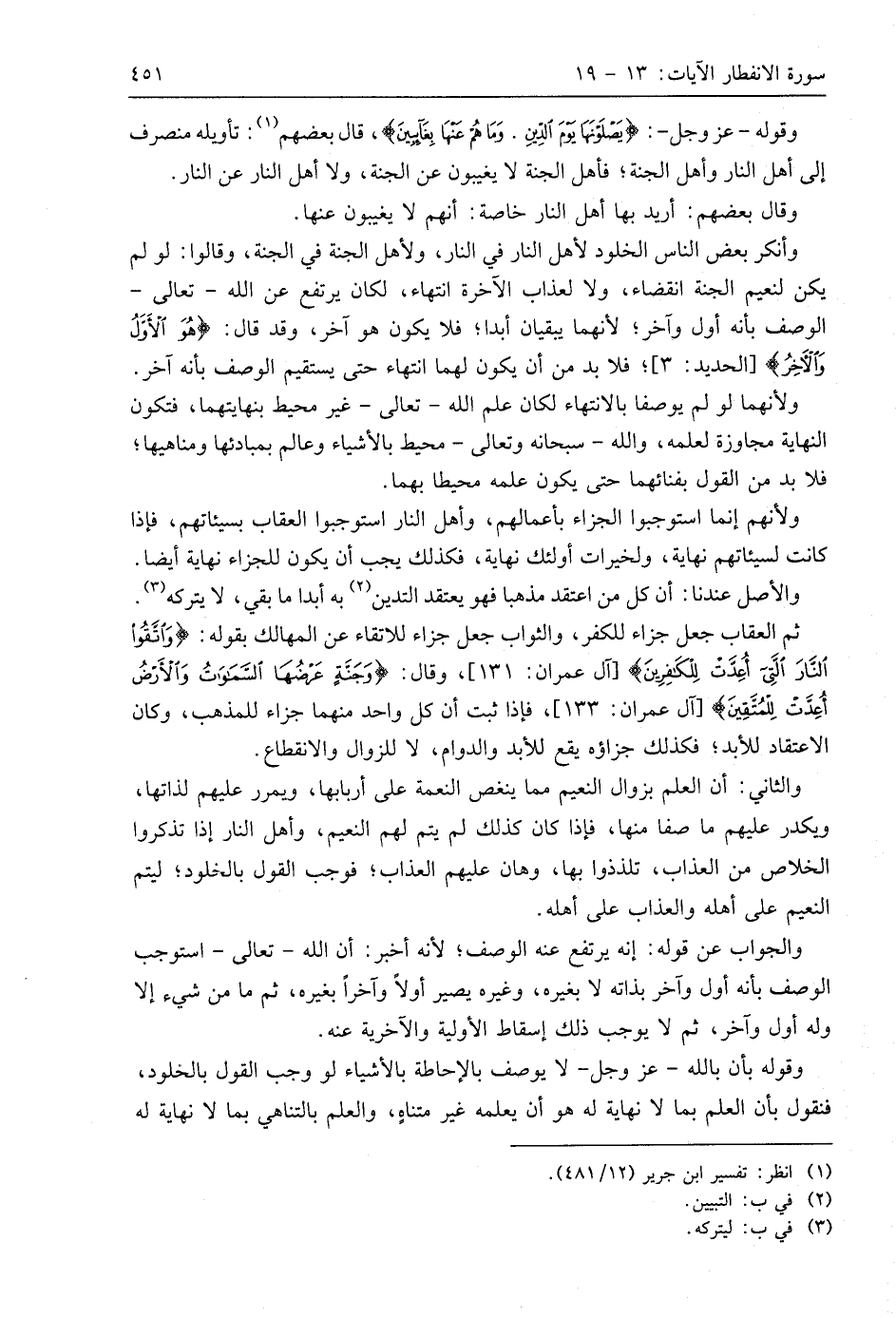 وقوله بأن [الله]- عَزَّ وَجَلَّ - لا يوصف بالإحاطة بالأشياء لو وجب القول بالخلود، فنقول بأن العلم بما لا نهاية له هو أن يعلمه غير متناهٍ، والعلم بالتناهي بما لا نهاية له