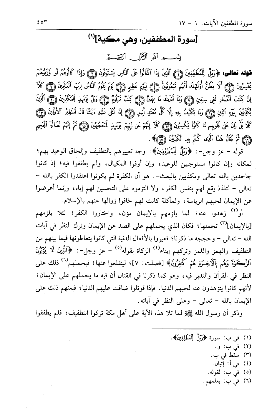 قوله تعالى: (وَيْلٌ لِلْمُطَفِّفِينَ (1) الَّذِينَ إِذَا اكْتَالُوا عَلَى النَّاسِ يَسْتَوْفُونَ (2) وَإِذَا كَالُوهُمْ أَوْ وَزَنُوهُمْ يُخْسِرُونَ (3) أَلَا يَظُنُّ أُولَئِكَ أَنَّهُمْ مَبْعُوثُونَ (4) لِيَوْمٍ عَظِيمٍ (5) يَوْمَ يَقُومُ النَّاسُ لِرَبِّ الْعَالَمِينَ (6) كَلَّا إِنَّ كِتَابَ الْفُجَّارِ لَفِي سِجِّينٍ (7) وَمَا أَدْرَاكَ مَا سِجِّينٌ (8) كِتَابٌ مَرْقُومٌ (9) وَيْلٌ يَوْمَئِذٍ لِلْمُكَذِّبِينَ (10) الَّذِينَ يُكَذِّبُونَ بِيَوْمِ الدِّينِ (11) وَمَا يُكَذِّبُ بِهِ إِلَّا كُلُّ مُعْتَدٍ أَثِيمٍ (12) إِذَا تُتْلَى عَلَيْهِ آيَاتُنَا قَالَ أَسَاطِيرُ الْأَوَّلِينَ (13) كَلَّا بَلْ رَانَ عَلَى قُلُوبِهِمْ مَا كَانُوا يَكْسِبُونَ (14) كَلَّا إِنَّهُمْ عَنْ رَبِّهِمْ يَوْمَئِذٍ لَمَحْجُوبُونَ (15) ثُمَّ إِنَّهُمْ لَصَالُو الْجَحِيمِ (16) ثُمَّ يُقَالُ هَذَا الَّذِي كُنْتُمْ بِهِ تُكَذِّبُونَ (17).